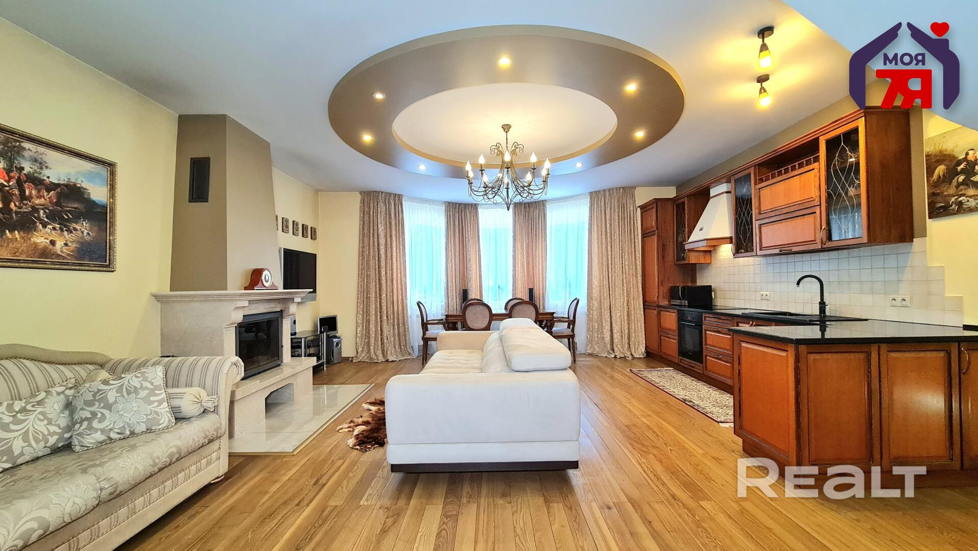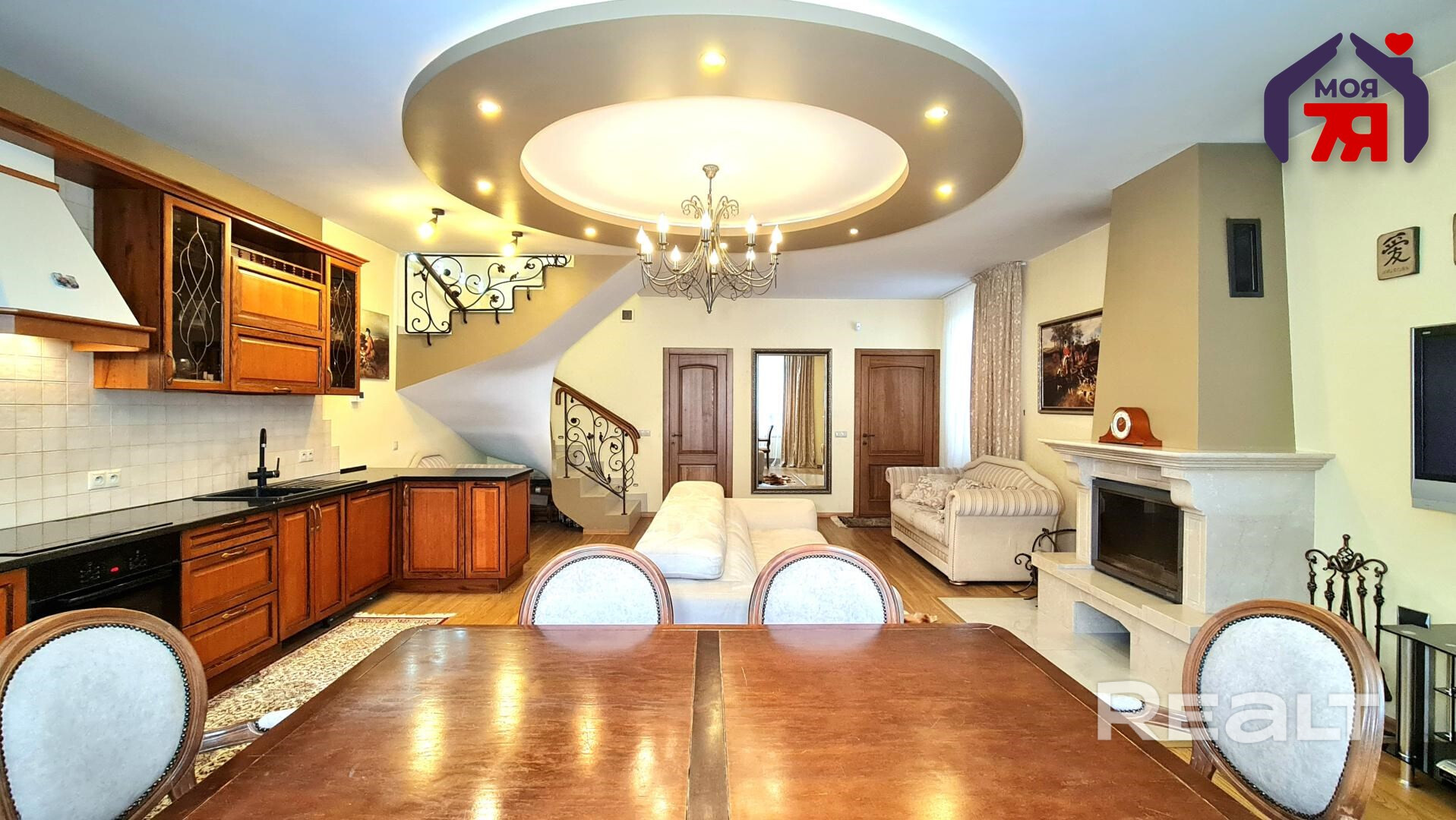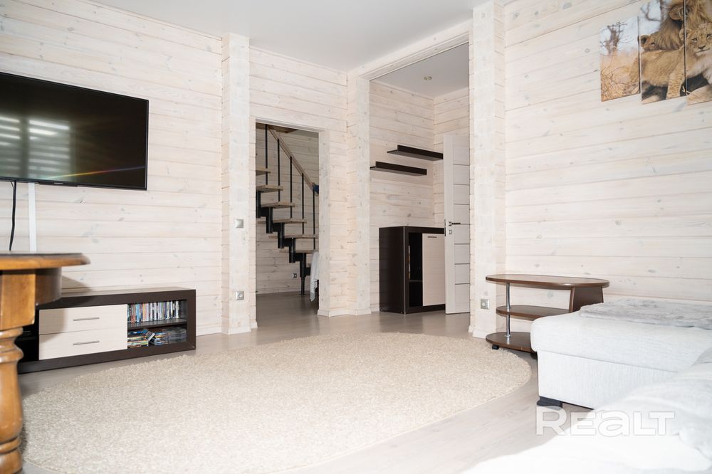 Общая площадь 121,9 м2. На первом этаже расположены гостиная-кухня с камином, санузел, топочная. Кухонный гарнитур также выполнен из массива, столешница каменная. Оснащен всем необходимым, включая встроенный холодильник, морозильник, электрическую плиту, духовку и посудомоечную машину. Дополнением первого этажа является мраморный камин с функцией обогрева всего дома.