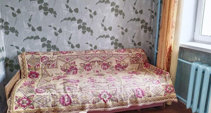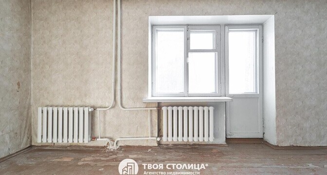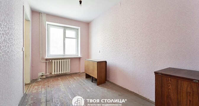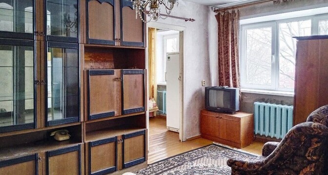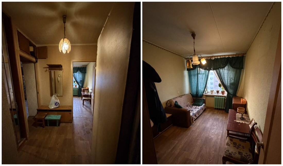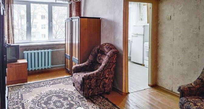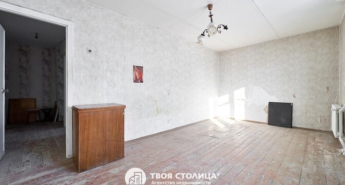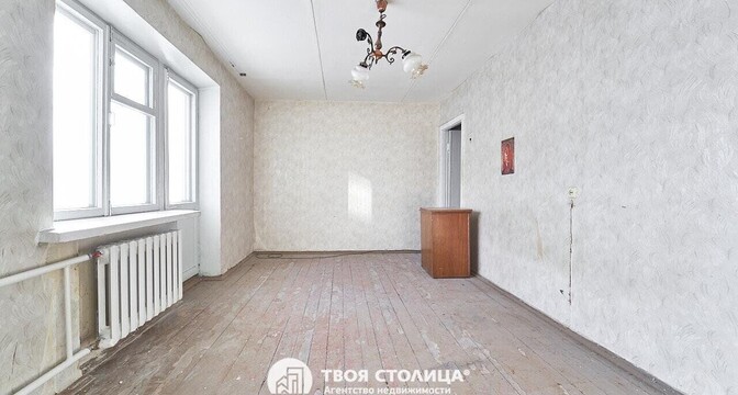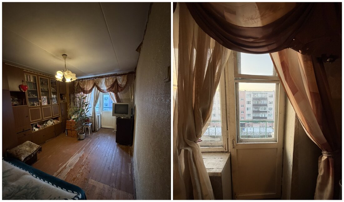 Жилье с одной проходной комнатой нуждается в обновлении: на полу лежат доски, стены оклеены обоями. Все окна выходят на одну сторону. Балкона тут нет, но останется подвальное помещение.