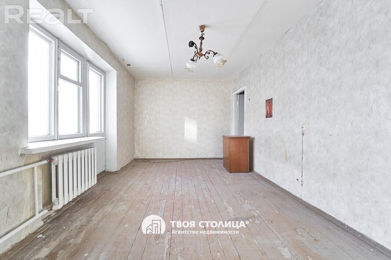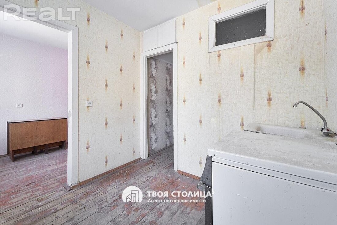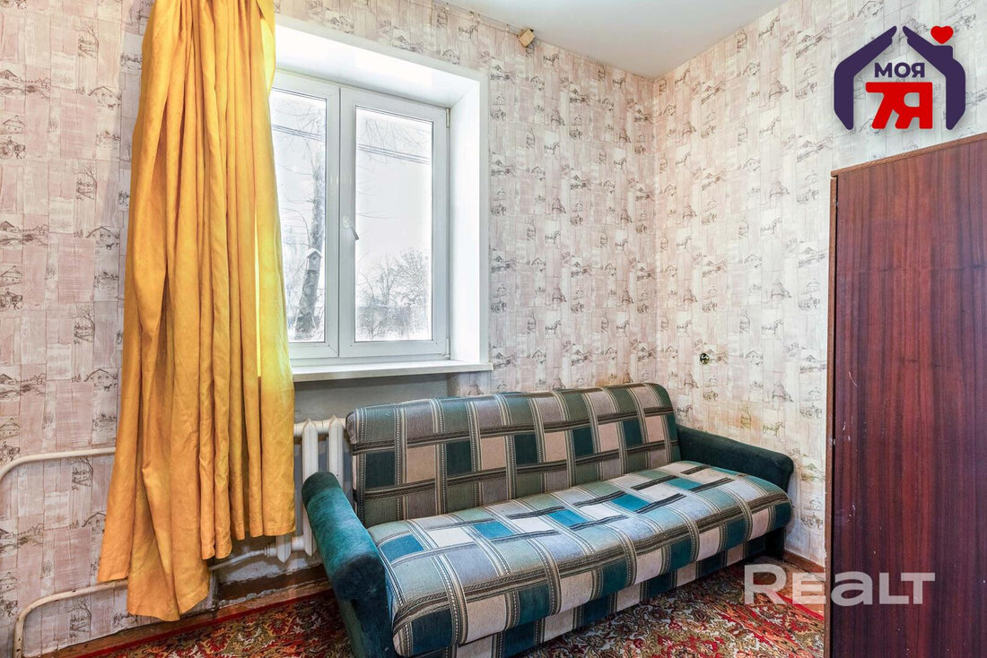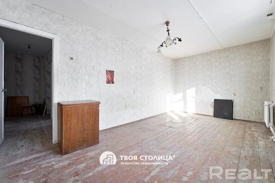 Жилье с одной проходной комнатой нуждается в обновлении: на полу лежат доски, стены оклеены обоями. Все окна выходят на одну сторону. Балкона тут нет, но останется подвальное помещение.