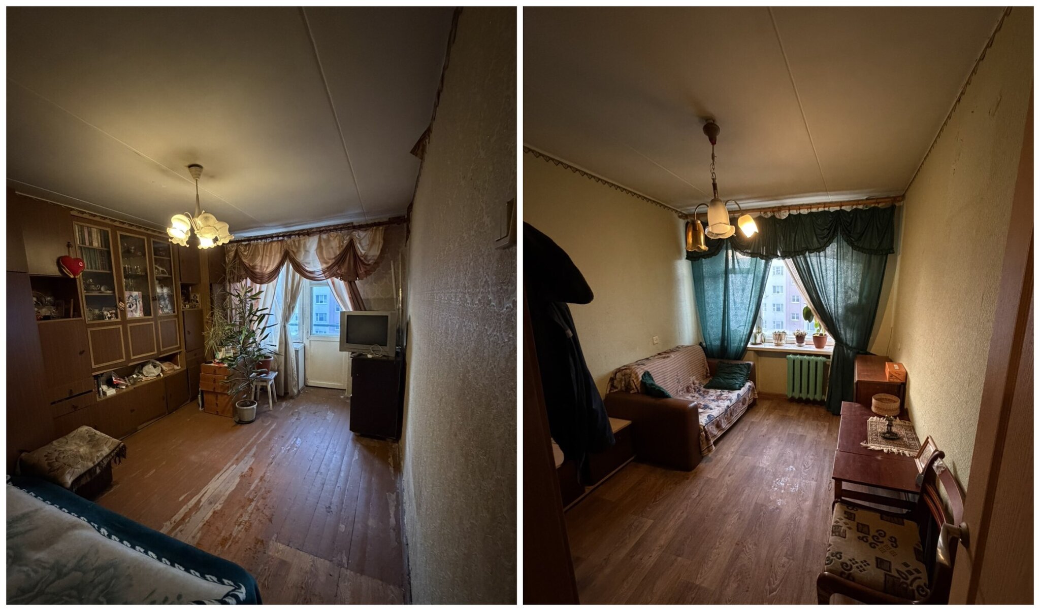 Двушка в жилом состоянии. Одна из комнат — проходная. Стены тут оклеены обоями, на полу лежит разное покрытие. Собственники оставляют мебель и технику.