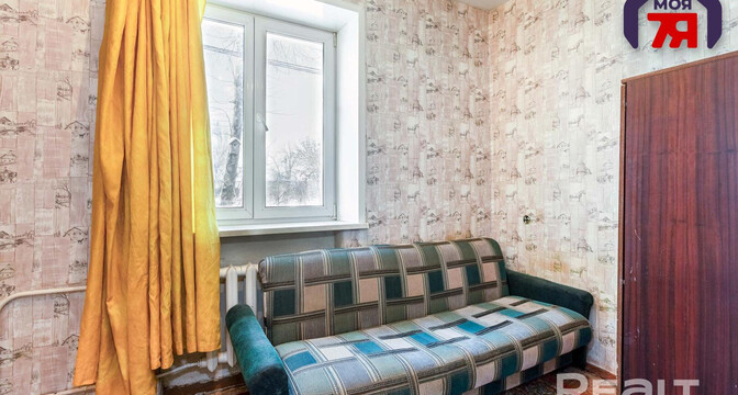 Жилье с одной проходной комнатой нуждается в обновлении: на полу лежат доски, стены оклеены обоями. Все окна выходят на одну сторону.