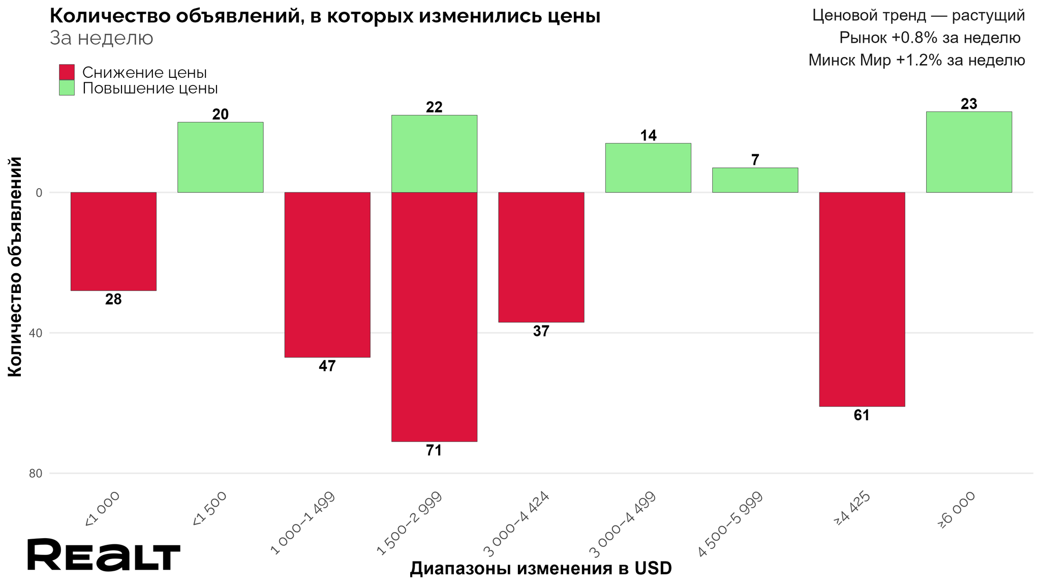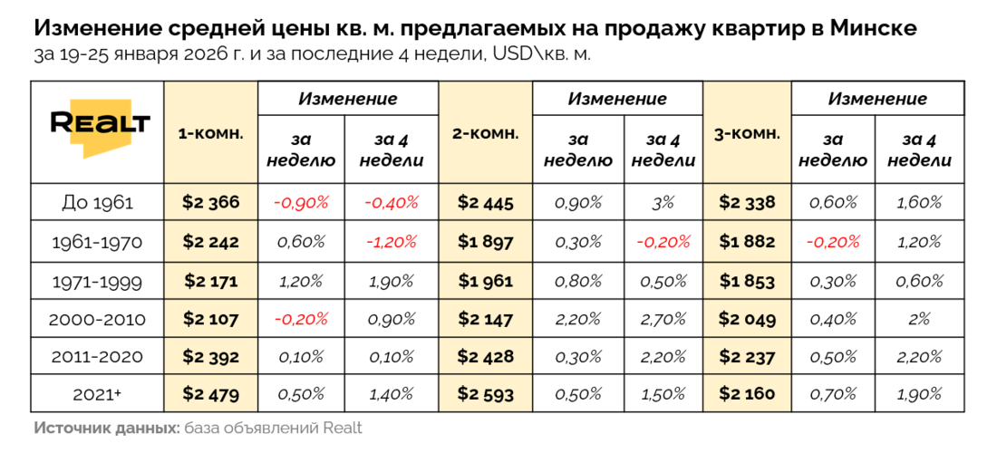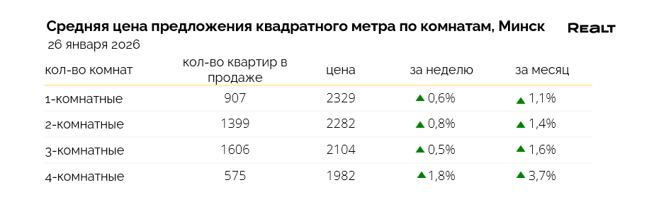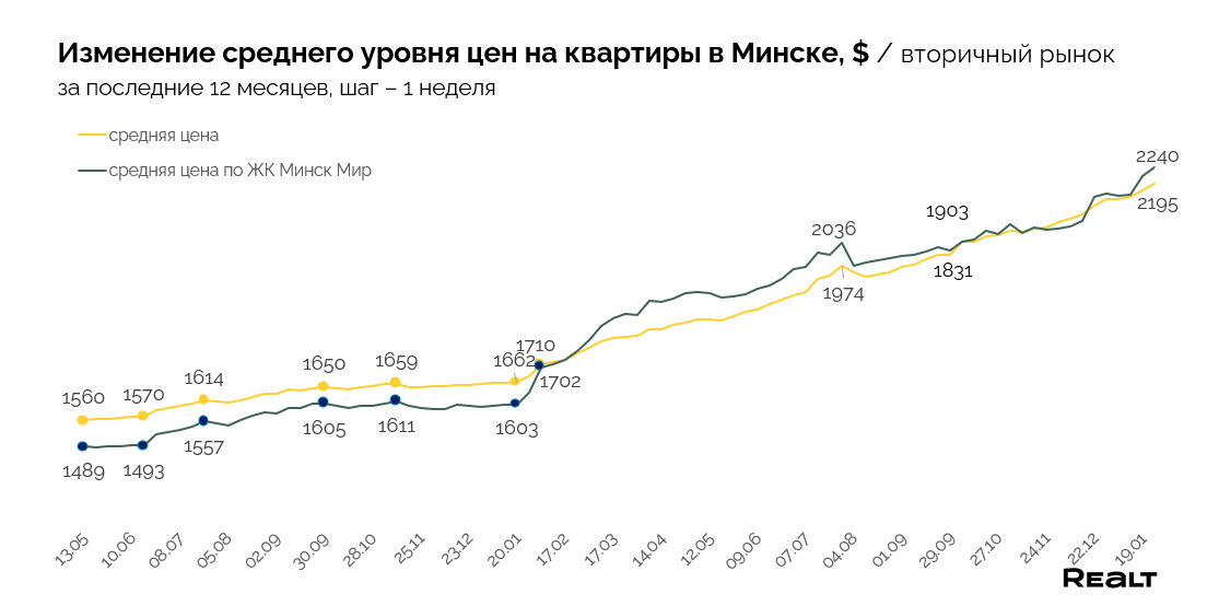 В результате, средняя цена квадрата в объявлениях по всему Минску, за прошедшую неделю увеличилась на 0.8% до уровня 2195 $/м2. А в Минск-Мире увеличение составило 1.2%, и на данный момент составляет уже 2240 $/м2.