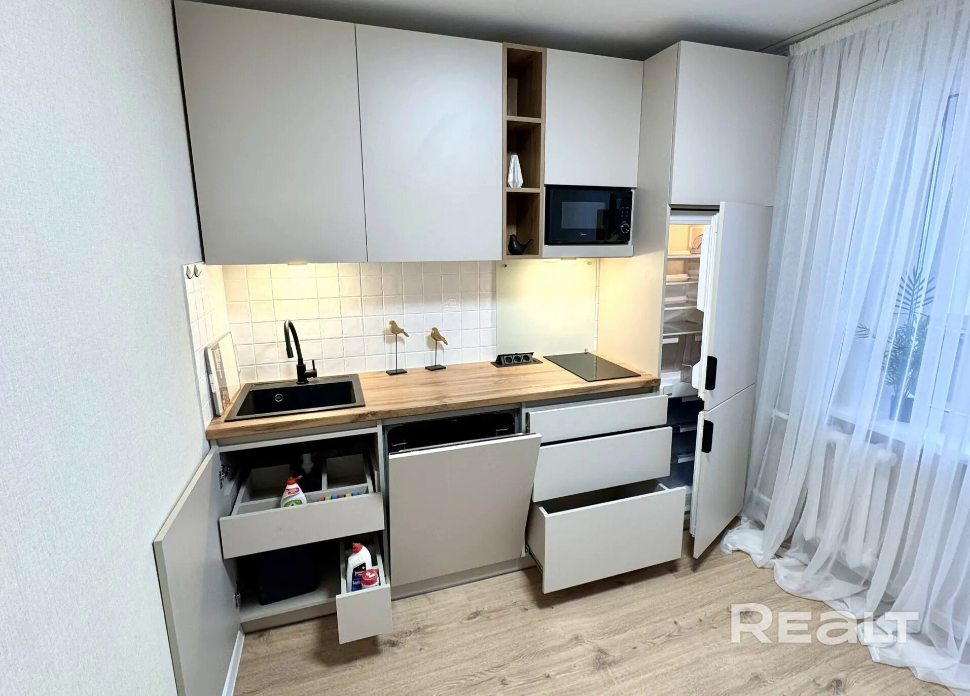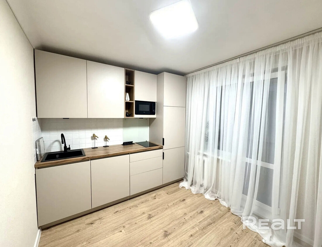 Однушка довольно просторная. На одну кухню приходится 9 квадратов. Здесь уже сделан ремонт, установлена и бытовая техника. Встроенная кухня идет с холодильником, индукционной варочной поверхностью и посудомоечной машиной.