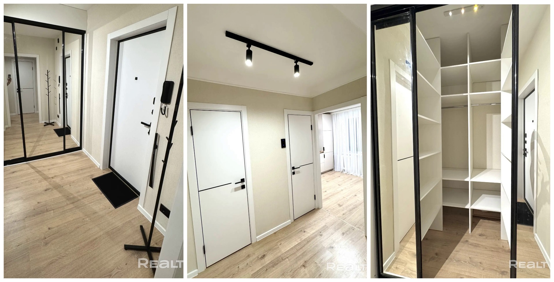 За счет большого коридора удалось сделать гардеробную, что скрывается за дверцами с зеркалами.