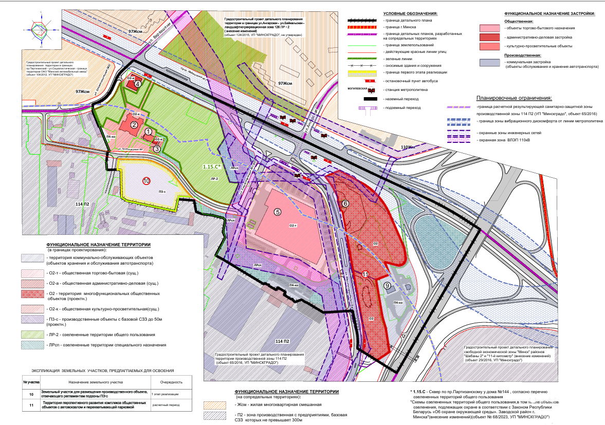 Проектируемая территория примыкает сразу к двум крупным магистралям — это собственно Партизанский проспект и МКАД. Наверняка, многие автомобилисты знают, насколько это загруженный участок. Представьте, что ежедневно именно через эти «ворота» в город въезжает до 60 тысяч автомобилей! Кроме того, здесь находится конечная красной ветки метро — станция «Могилевская», которой пользуются жители Ангарской, Шабанов, Сосен и всего юго-восточного пригорода столицы. При этом на самом проектируемом участке жилых домов нет, здесь представлена только улично-дорожная сеть (она занимает 34%), общественная и производственная застройка. Среди крупных объектов — ТЦ «Момо», Дворец детей и молодежи «Золак», несколько административных зданий, протестантская церковь Вефиль, две АЗС и автомойка.