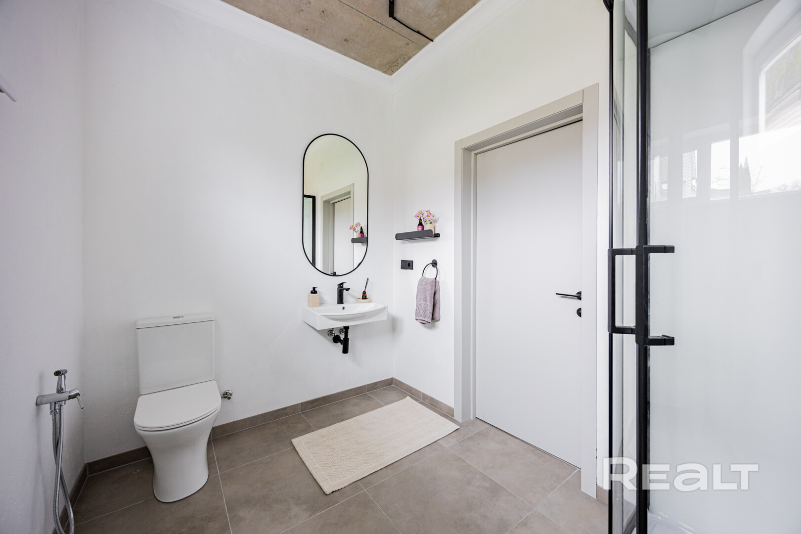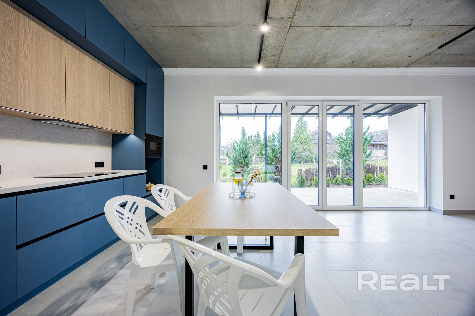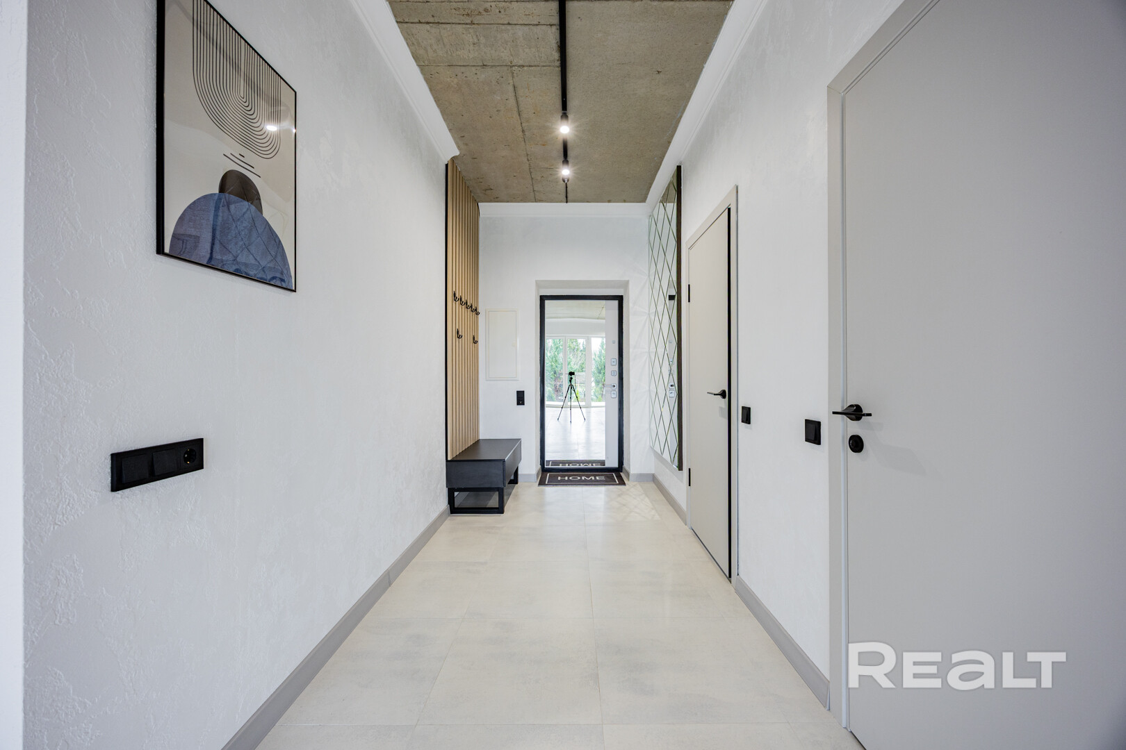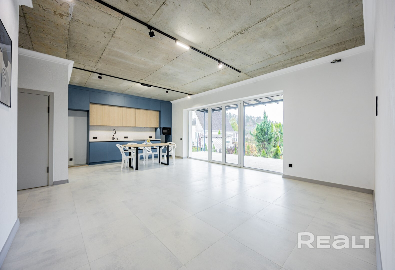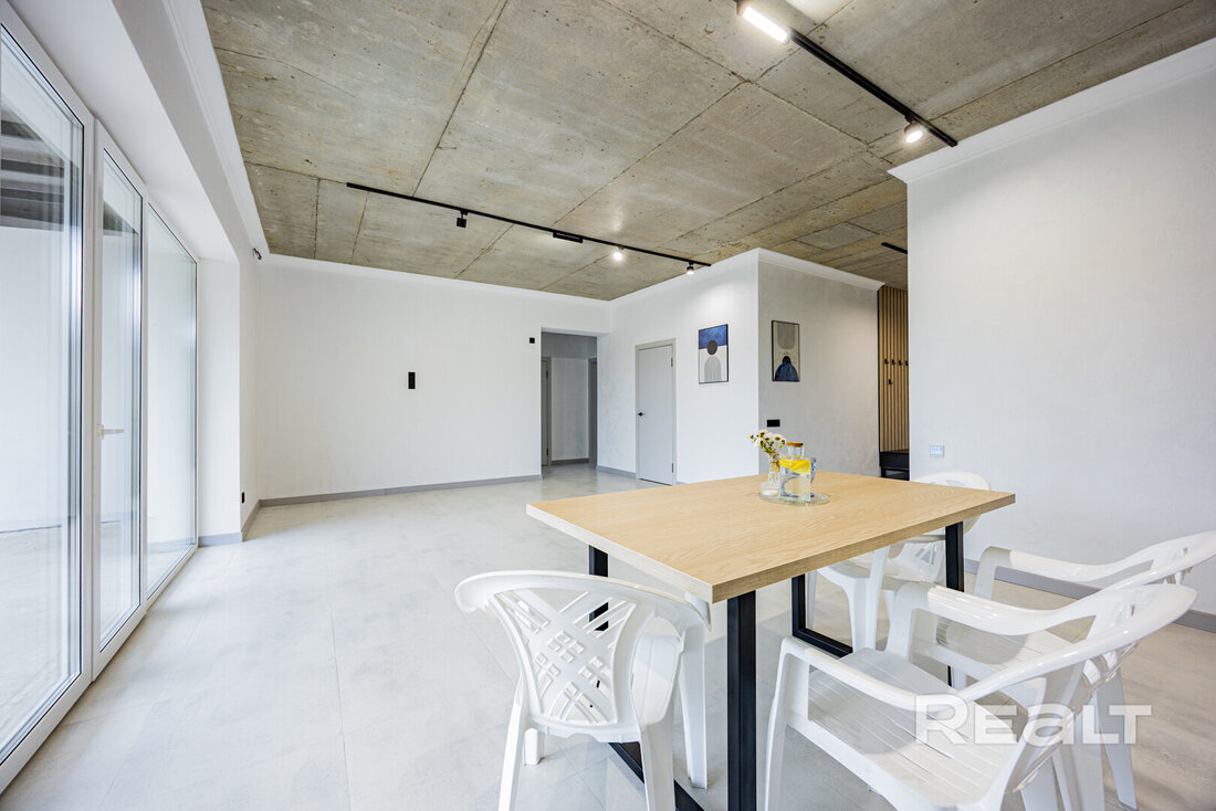 Внутри сделан стильный ремонт в современном стиле: на полах крупноформатная плитка и ламинат, стены покрашены в нейтрально белый, потолок бетонный (под стиль лофт).