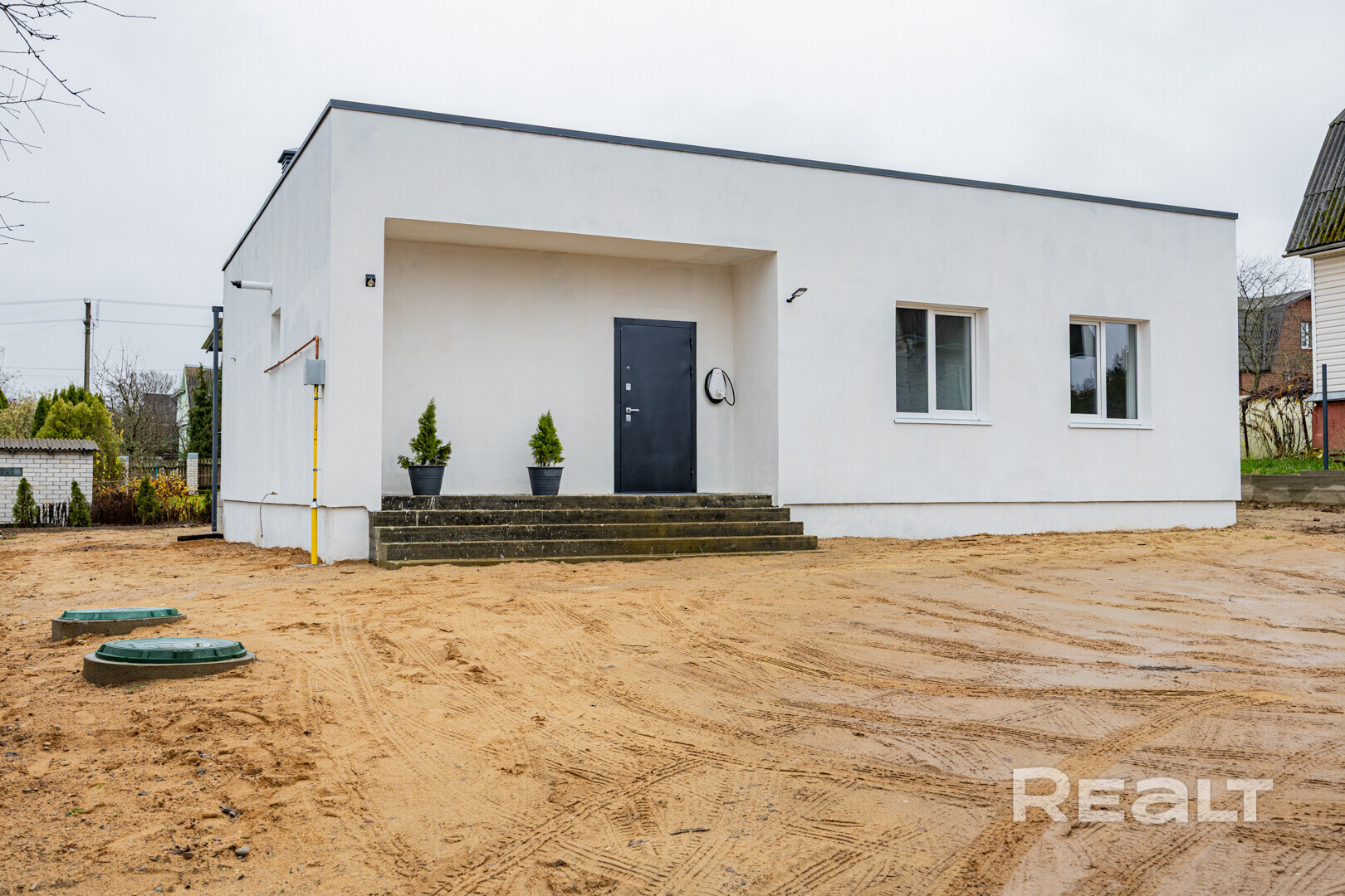Дом одноэтажный, с плоской крышей. Построен из блоков, утеплен и оштукатурен. Стоит на свайно-ростверковом утепленном фундаменте. Перекрытие крыши — монолитное железобетонное. Высота потолков — 3 метра. Построен в 2025 году.