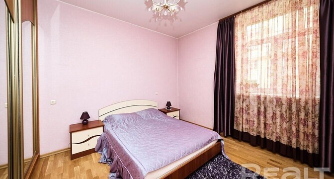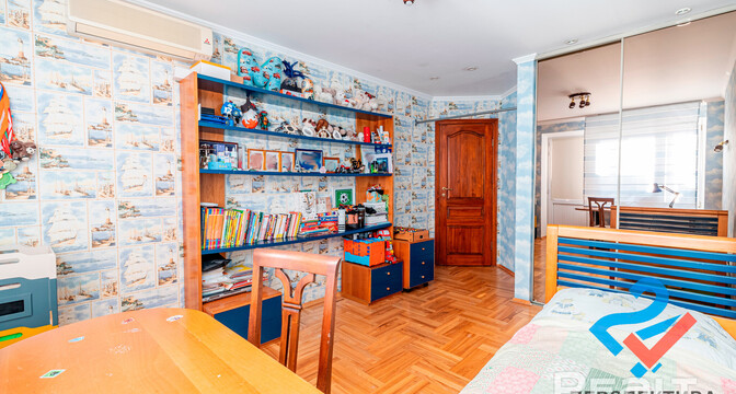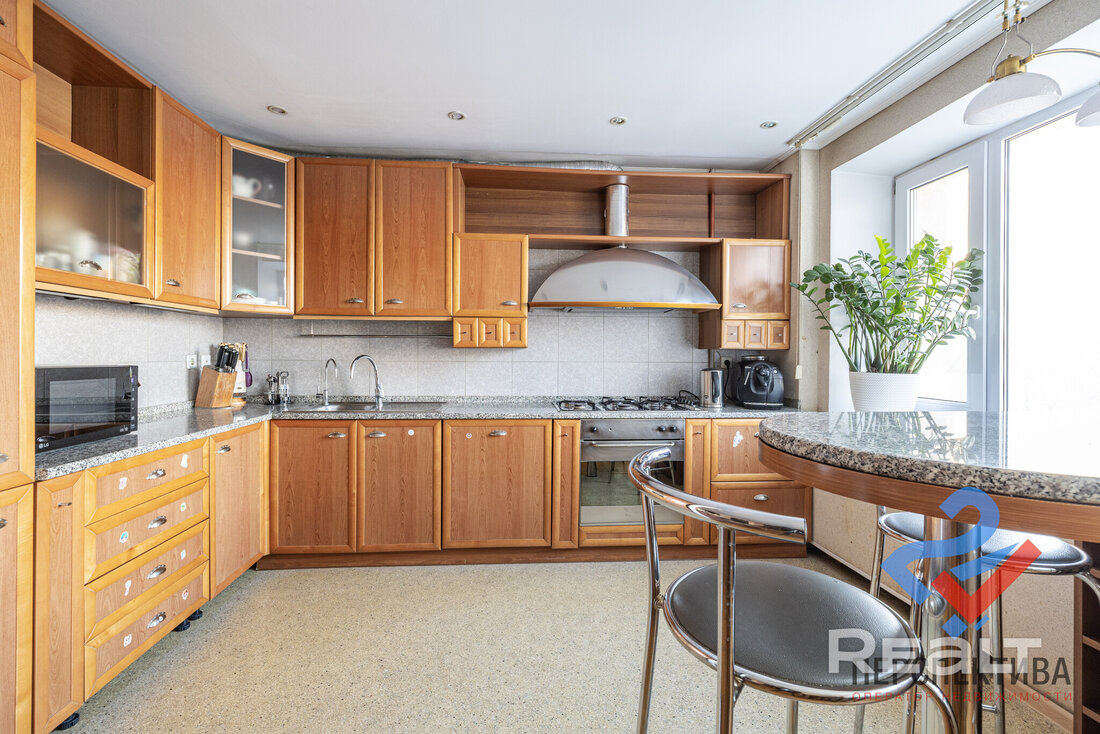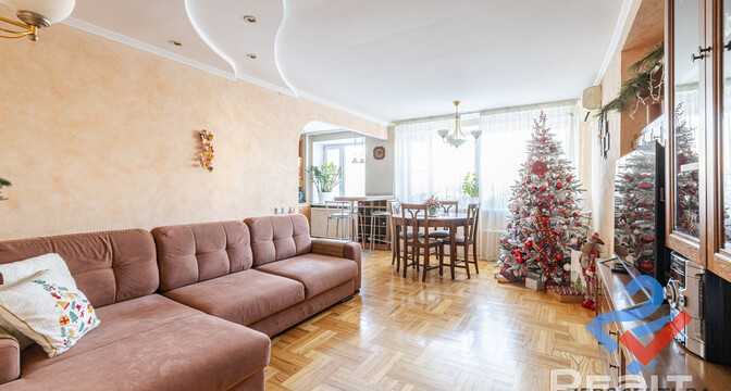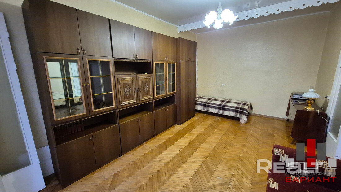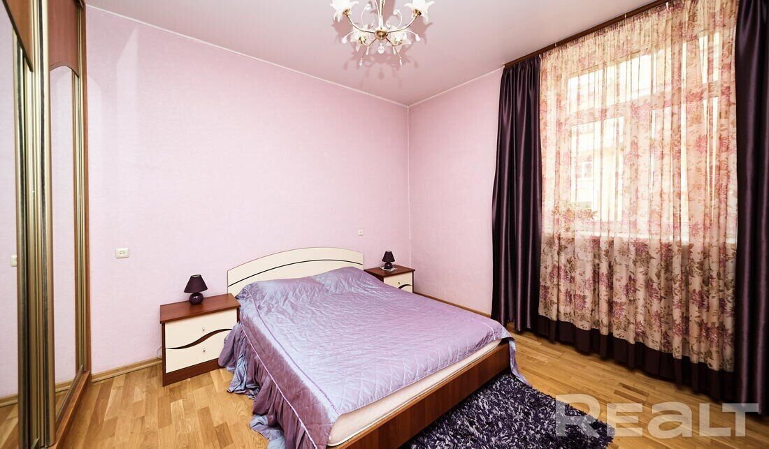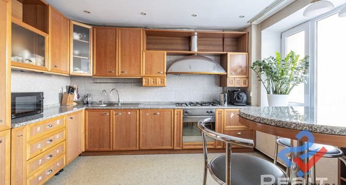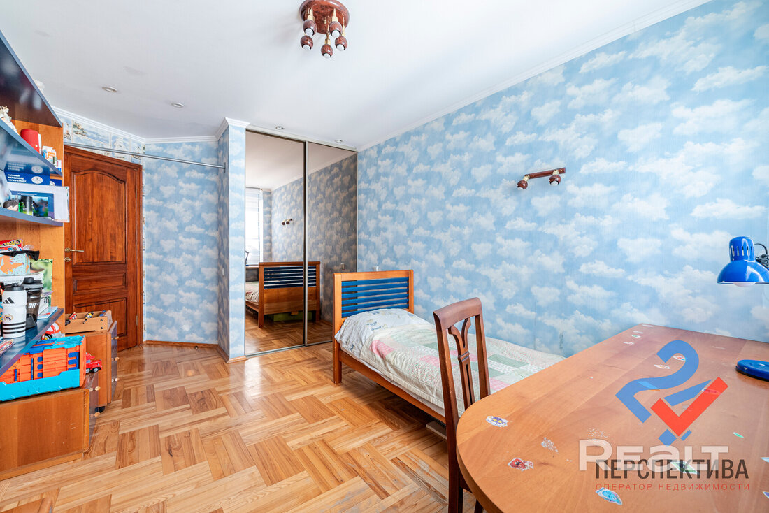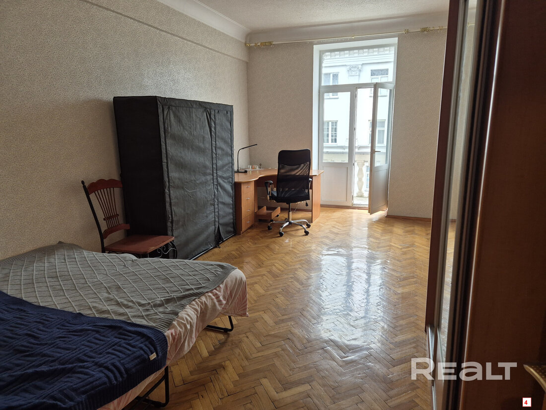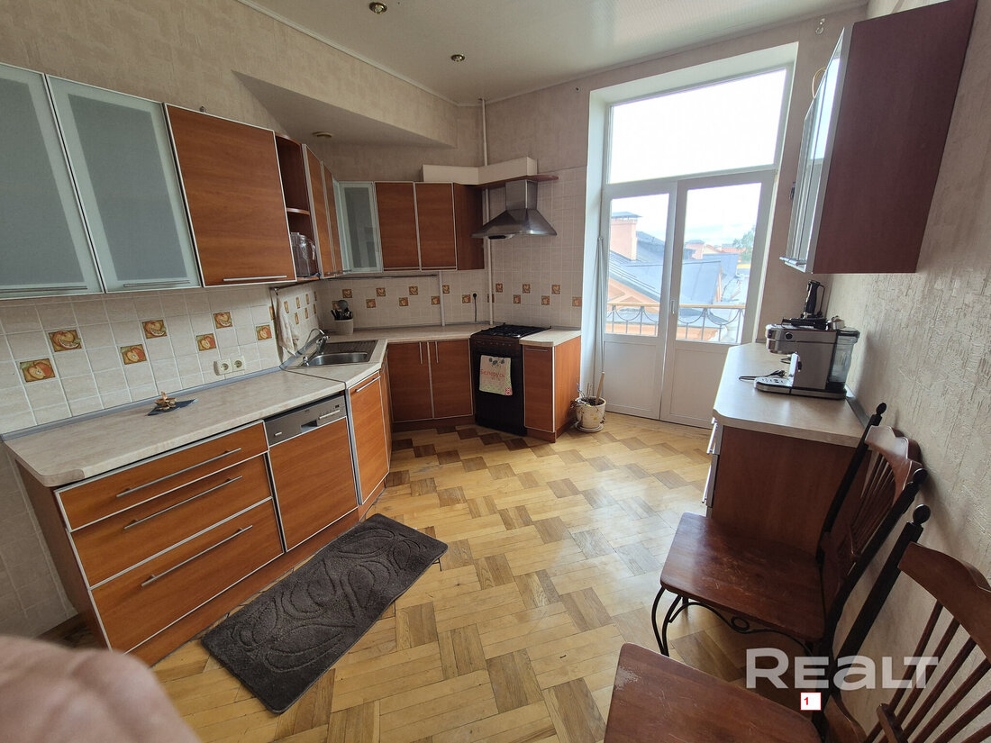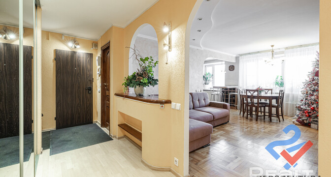 Самая дорогая квартира выставляется по адресу Максима Танка, 10. Это пятикомнатная квартира площадью 104,9 м² находится на третьем этаже. Кухня и гостиная тут объединены. Остальные комнаты — три детские и одна хозяйская спальня. В жилых комнатах на полу лежит паркет, а санузлы облицованы плиткой.