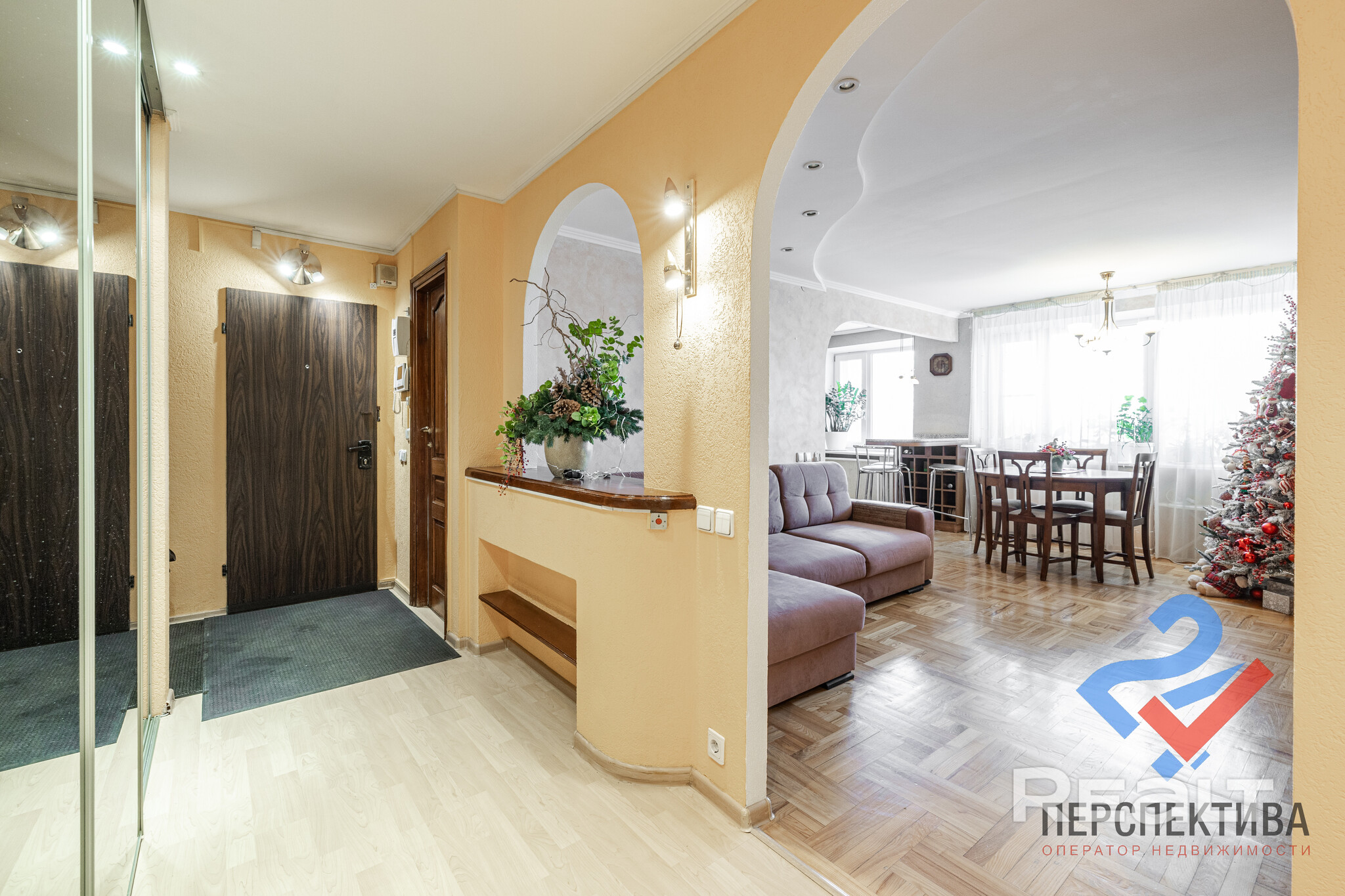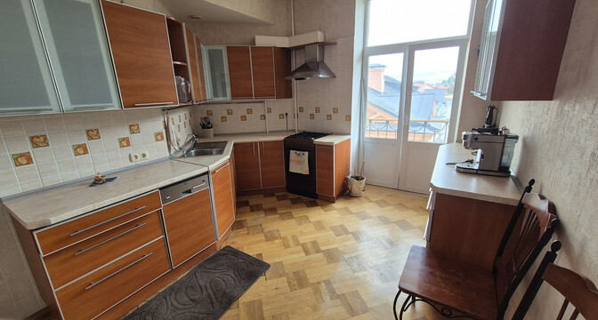 Вторая квартира — трешка на четвертом этаже. Ее площадь — 88,5 м². На кухню выделено 14 квадратов. Жилье тоже с духом того времени: высокими потолками, паркетом на полу, розетками на потолке и арочными проемами. Окна в кухне и одной комнате выходят во двор, остальные смотрят на улицу Карла Маркса.