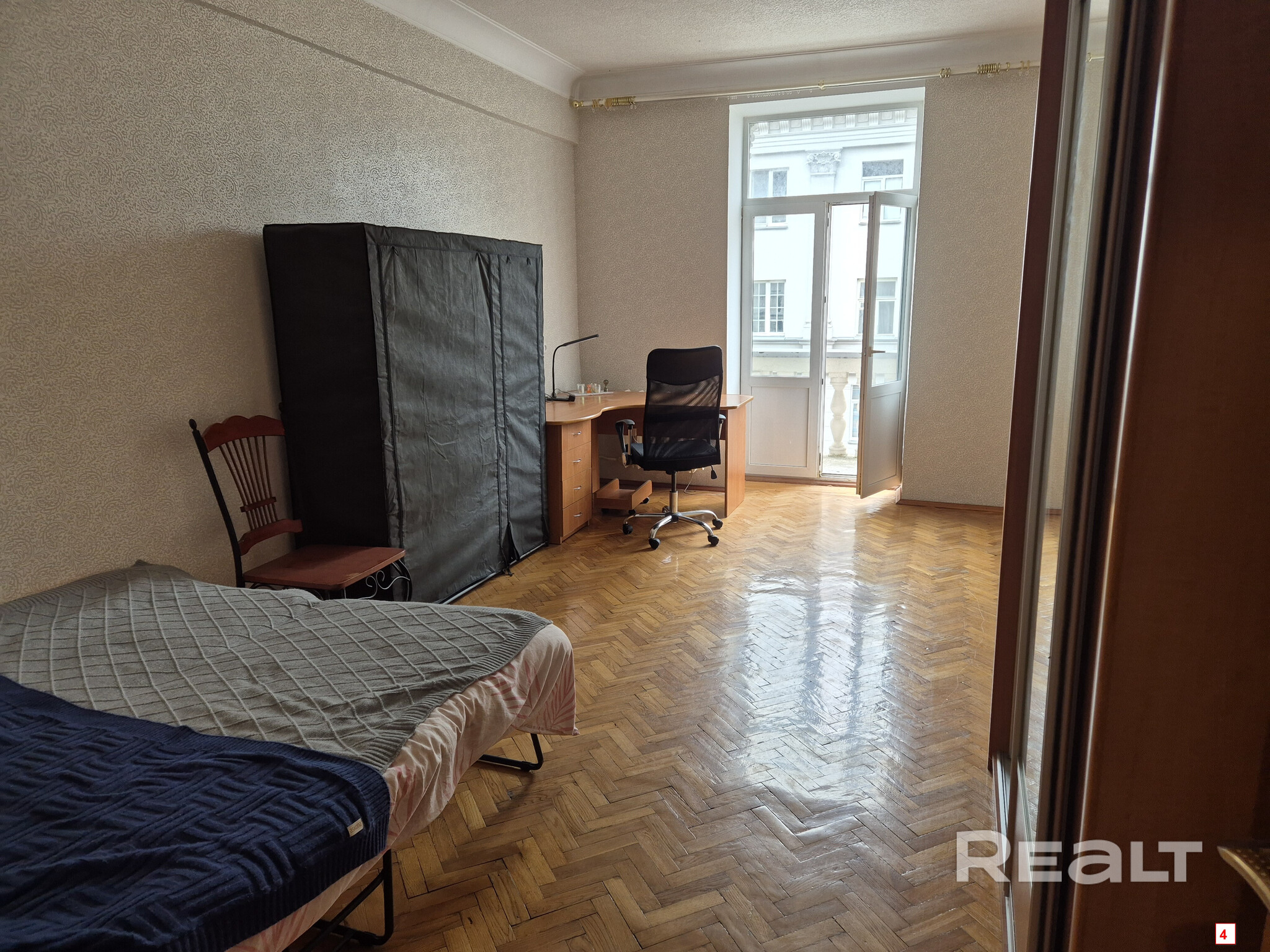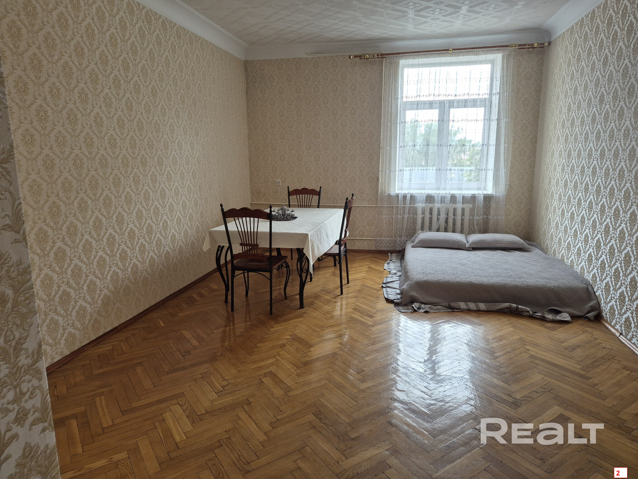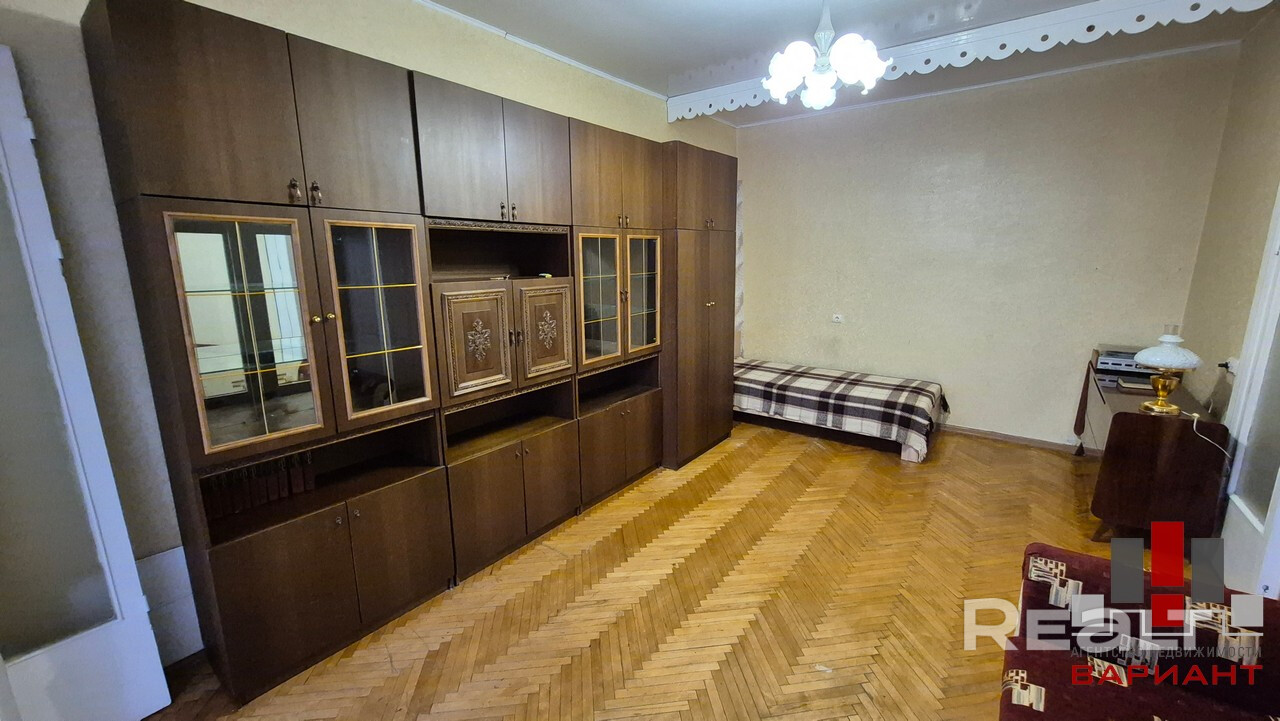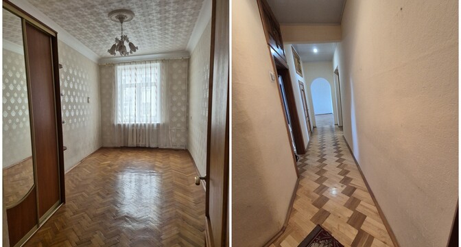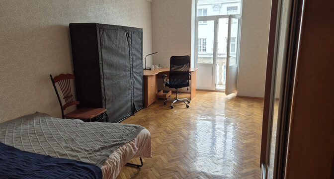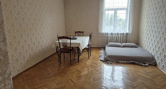 Квартира с потолками в 3 метра выглядит аккуратной, но нуждается в обновлении. Здесь сохранился паркет на полу, советская мебель. Стены оклеены обоями, а в окнах стоят стеклопакеты.