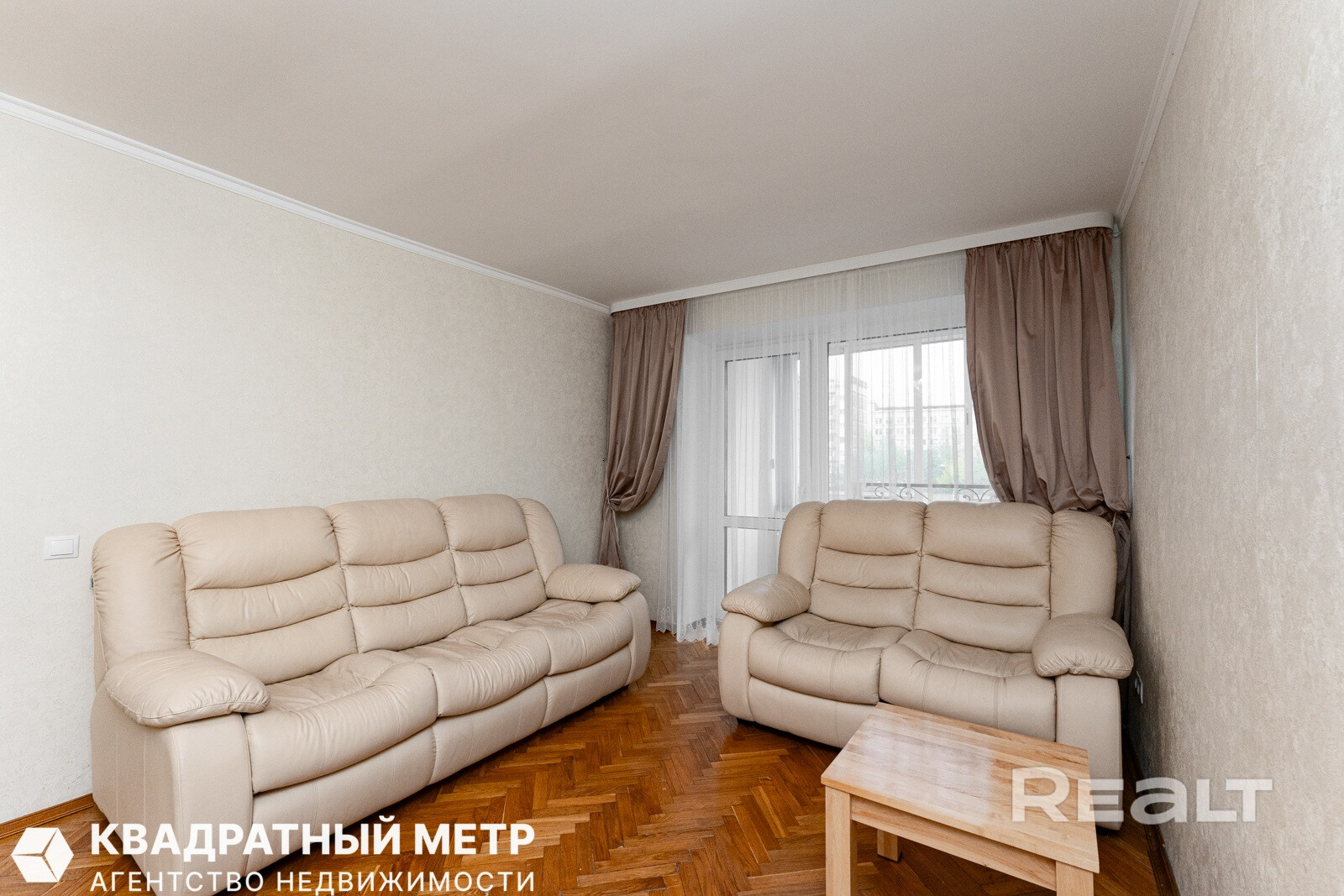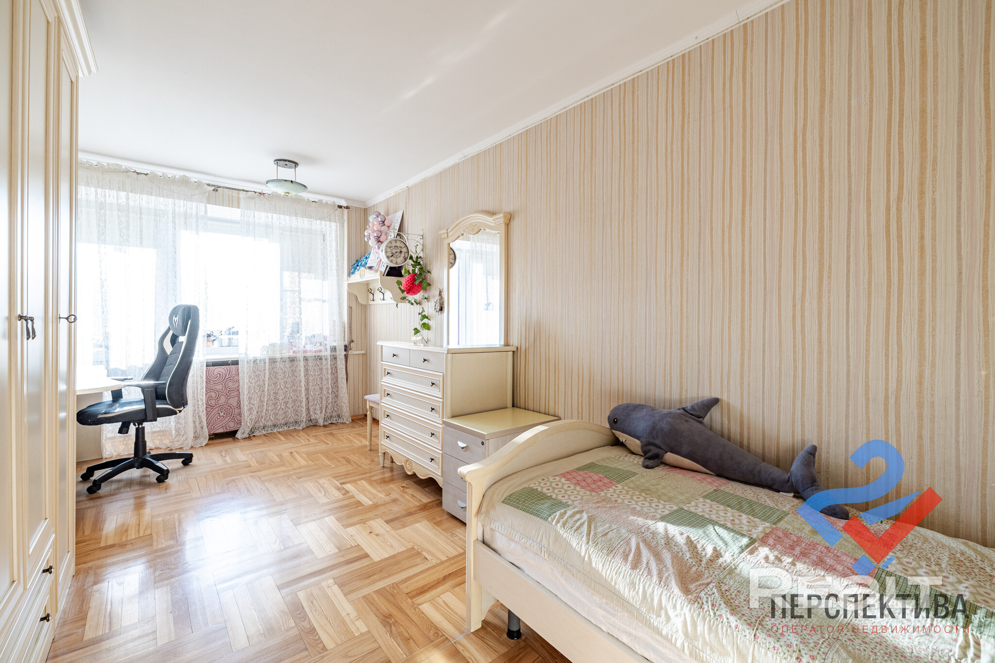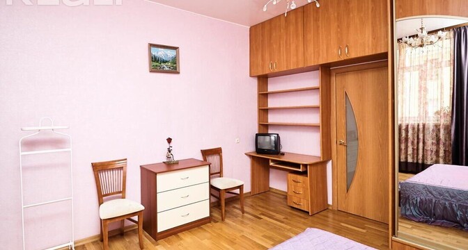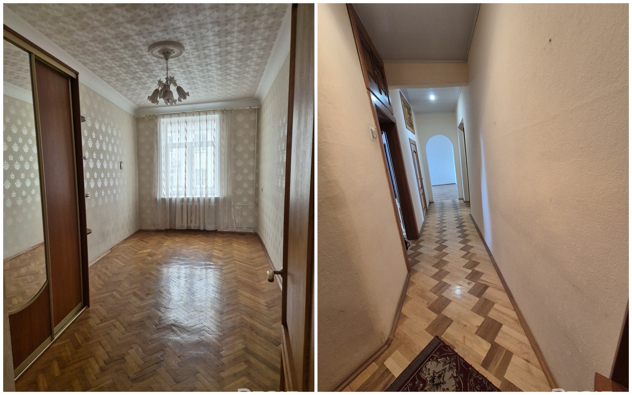 Квартира с потолками в 3 метра выглядит аккуратной, но нуждается в обновлении. Здесь сохранился паркет на полу, советская мебель. Стены оклеены обоями, а в окнах стоят стеклопакеты.