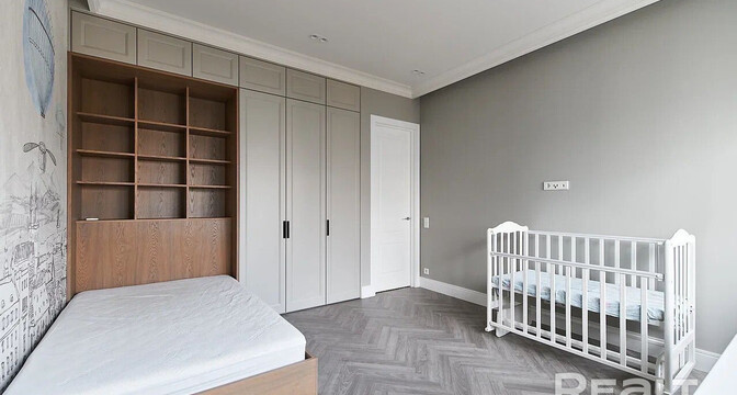 В двух комнатах обустроены хозяйская спальня с гардеробной и детская.