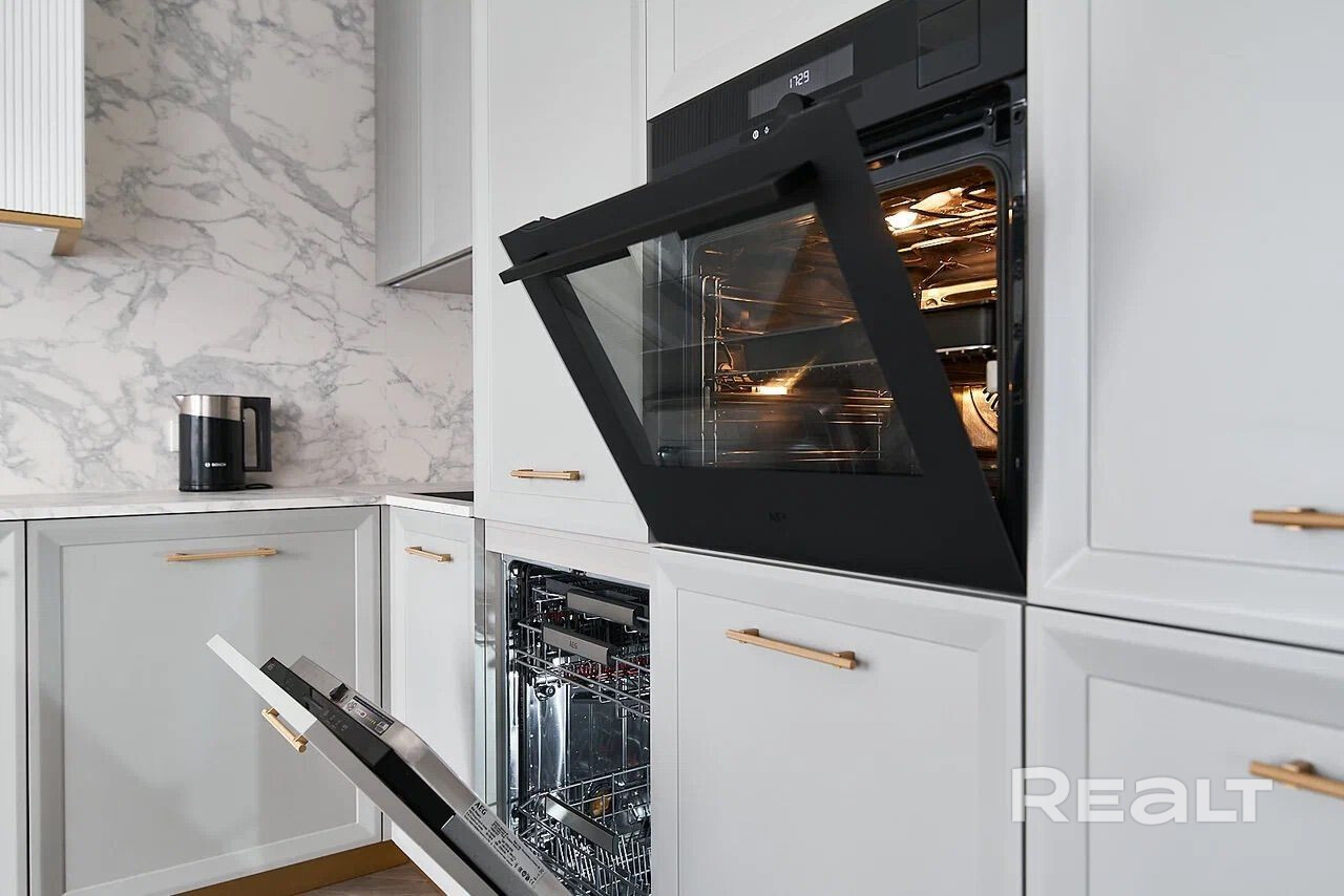 Квартира совмещена с гостиной. Жилье отделали в светлых оттенках. Мебель сделана на заказ, мягкая — фабричная, итальянского производства. Остается после продажи и техника бренда AEG: варочная панель, духовой шкаф, посудомоечная машинка. Имеется и холодильник от Liebherr.