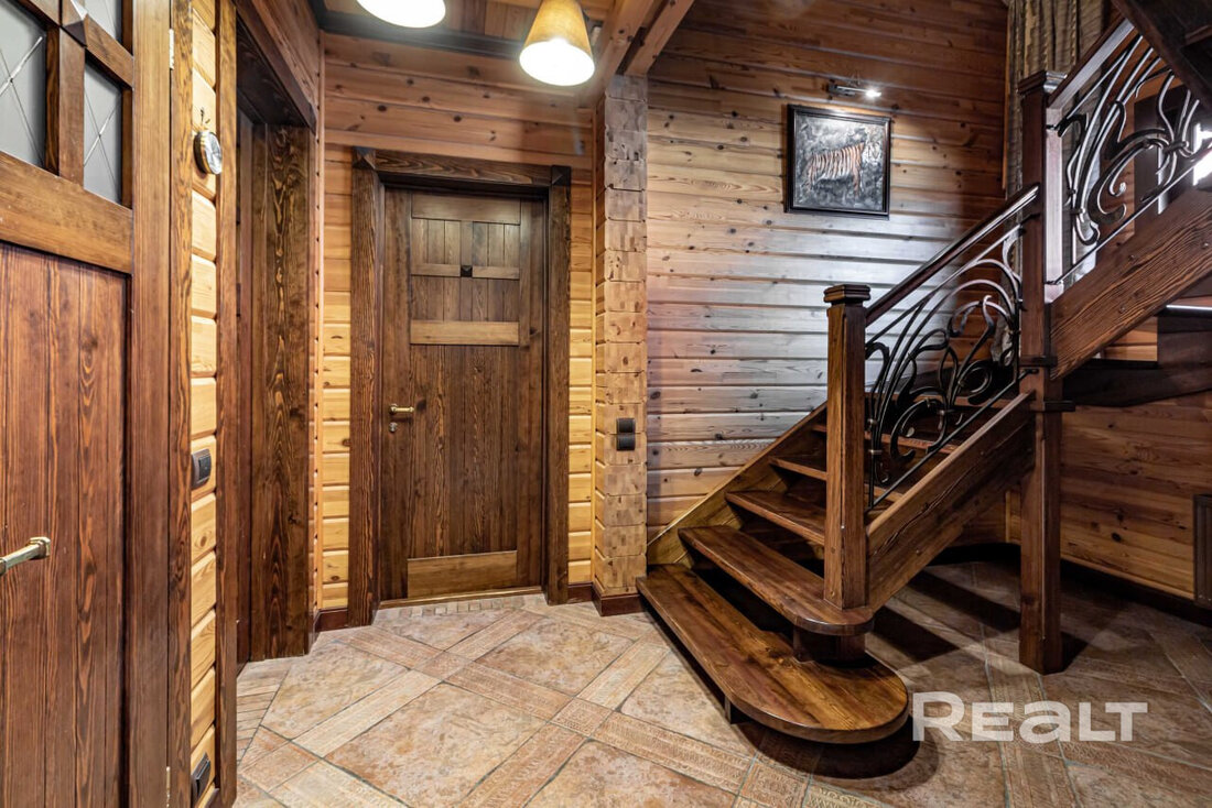 В отделке использованы качественные отделочные материалы: на полах мрамор, травертин, дубовый паркет, итальянская плитка, оникс. Стены вручную отшлифованы и покрыты маслом OSMO для сохранения природной текстуры дерева. Двери и окна — премиальные Porte Vista, трехкамерные деревянные стеклопакеты с атермальными стеклами.