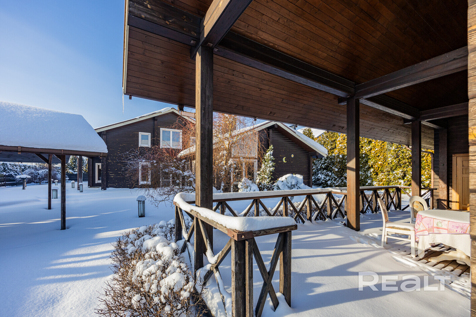 Основной дом двухэтажный, с панорамными окнами, построен из клееного бруса Wooden House. Это просторное строение — общая площадь составляет 323 м2.