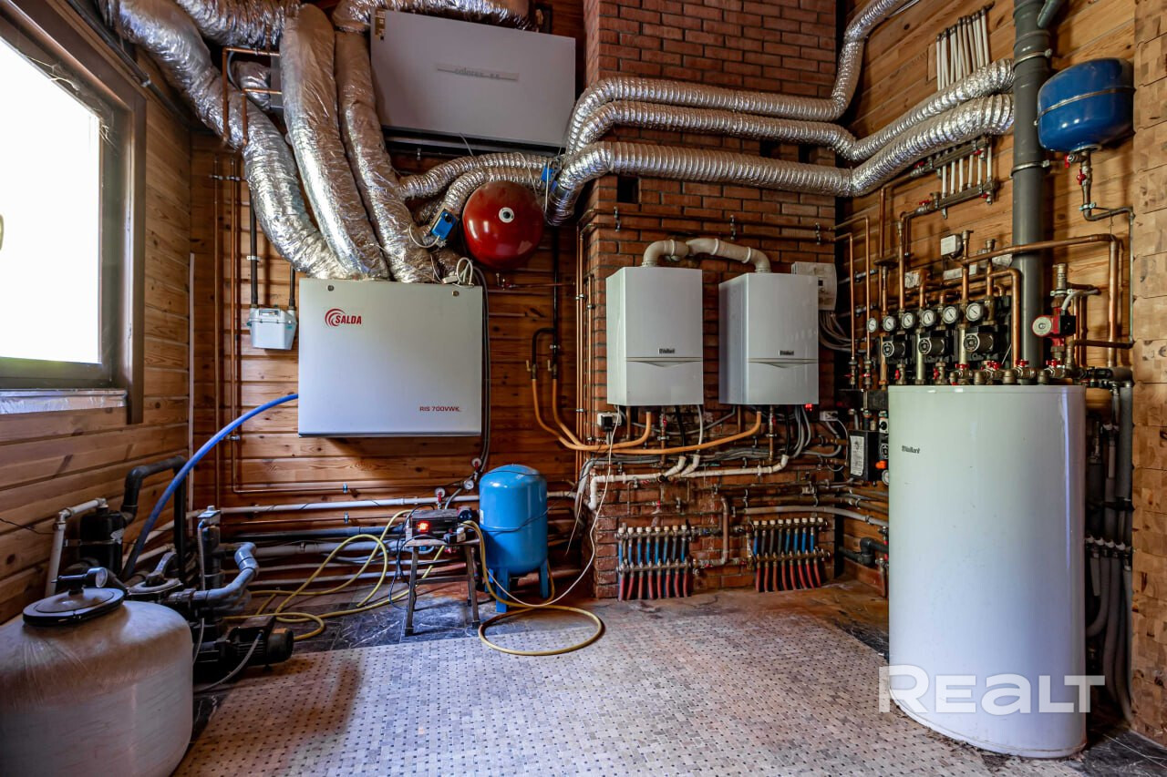 В котельной расположены два новых газовых котла Vaillant — для отопления и нагрева воды в бассейне. Вода из своей скважины, канализация — септик. Электричество 15 кВт.