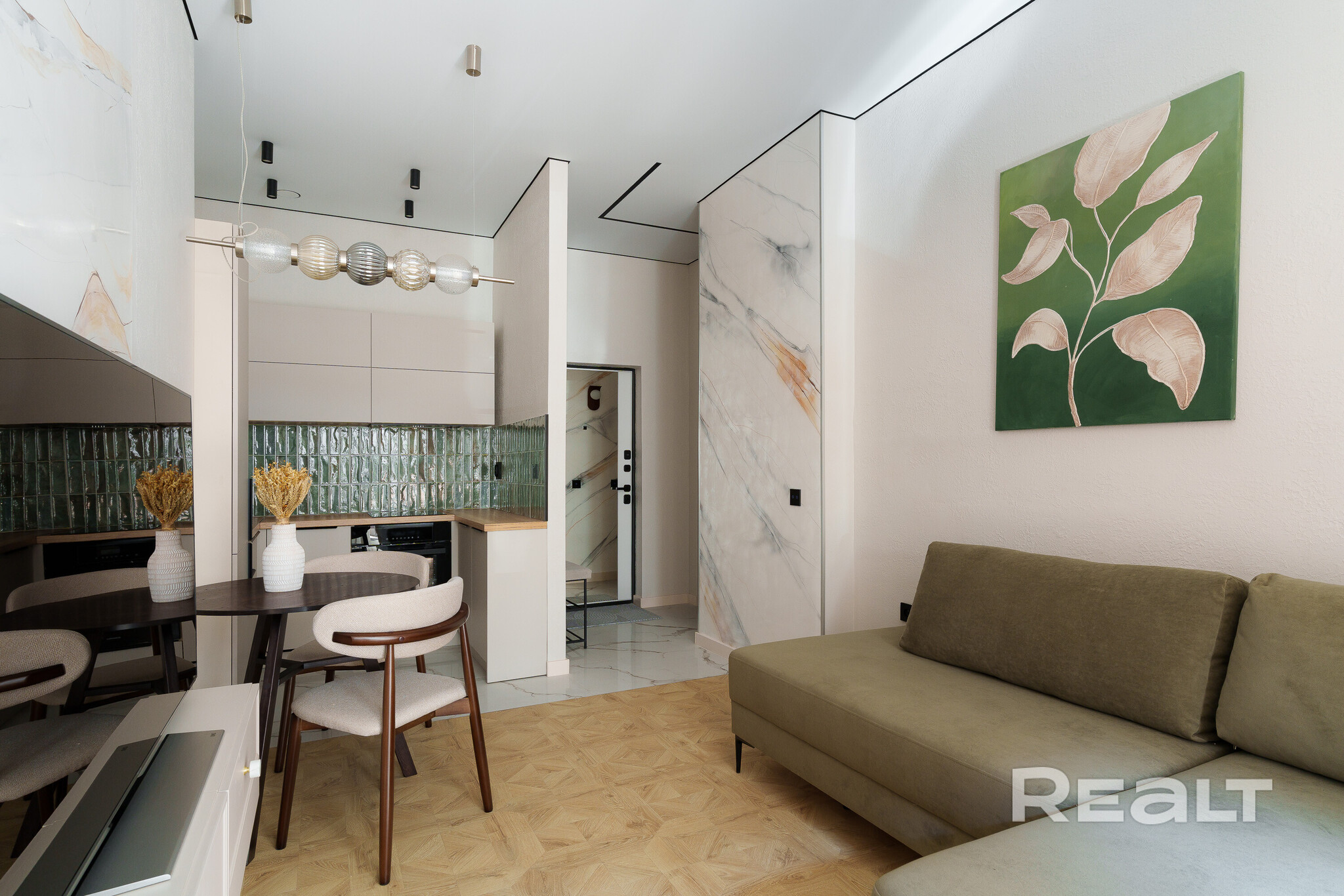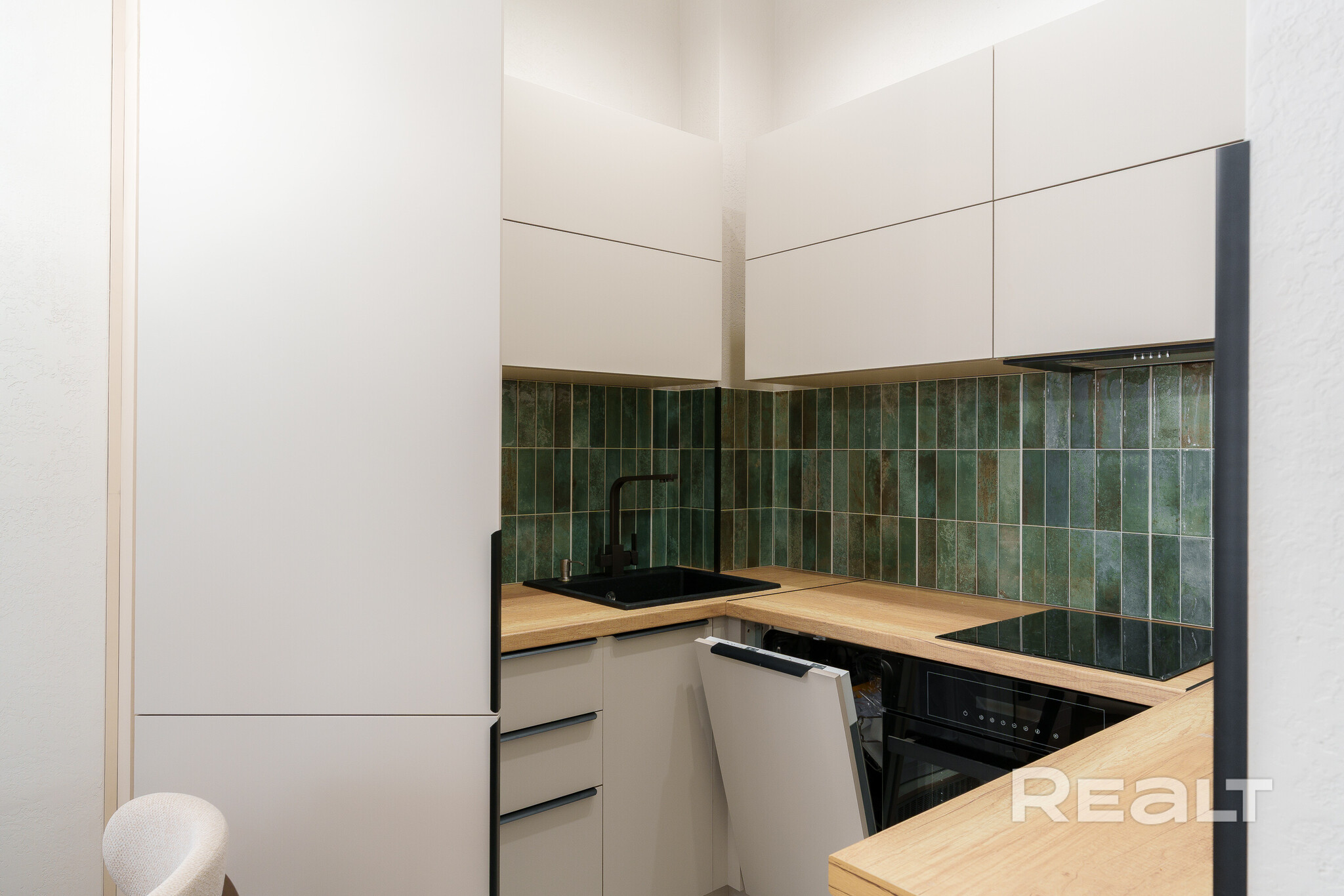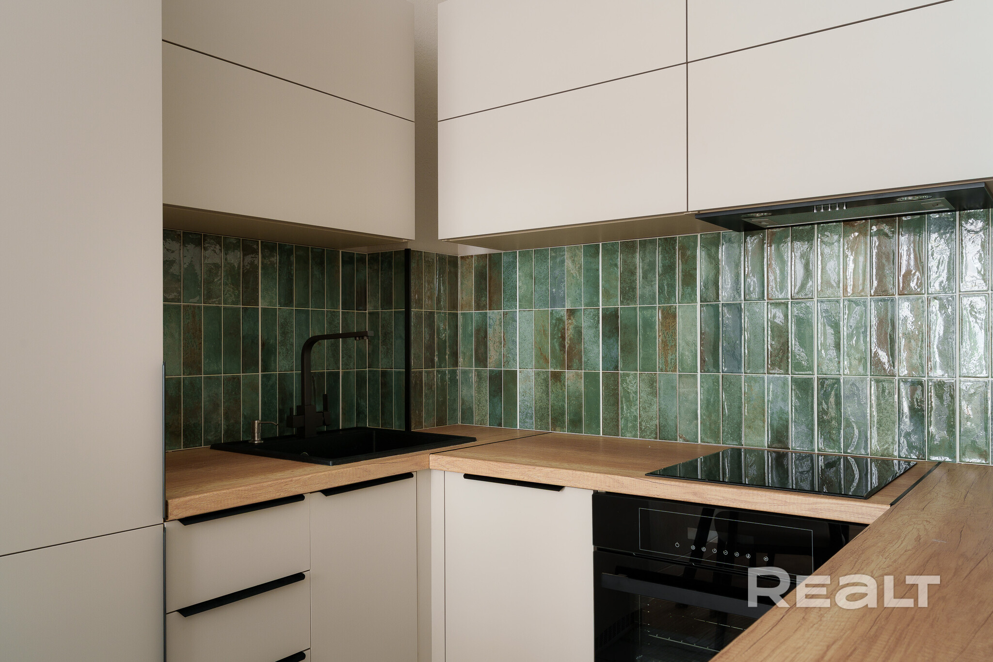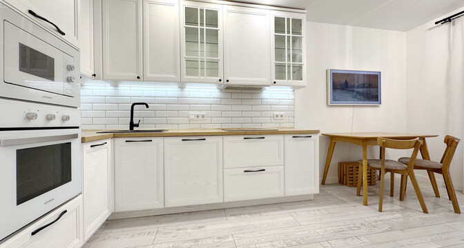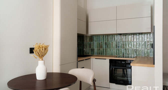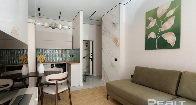 Сделан стильный ремонт. Интерьер выполнен в молочных оттенках. В кухонной зоне яркий акцент — кухонный фартук, выложенный плиткой глубокого зеленого цвета.