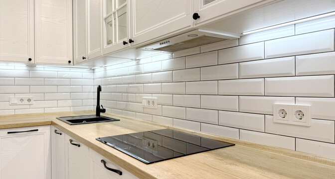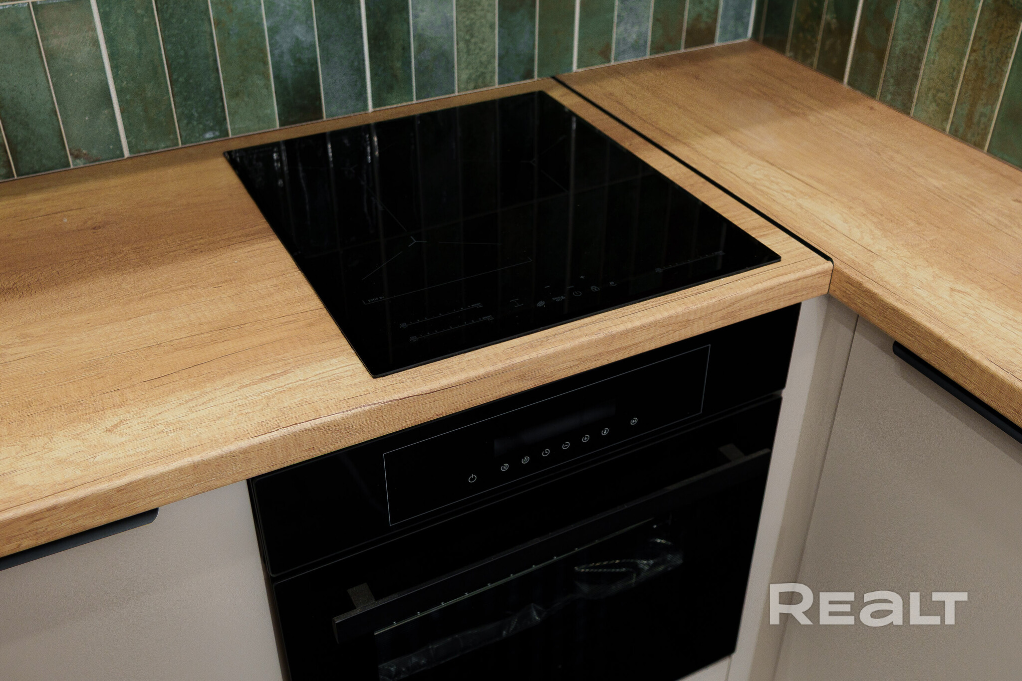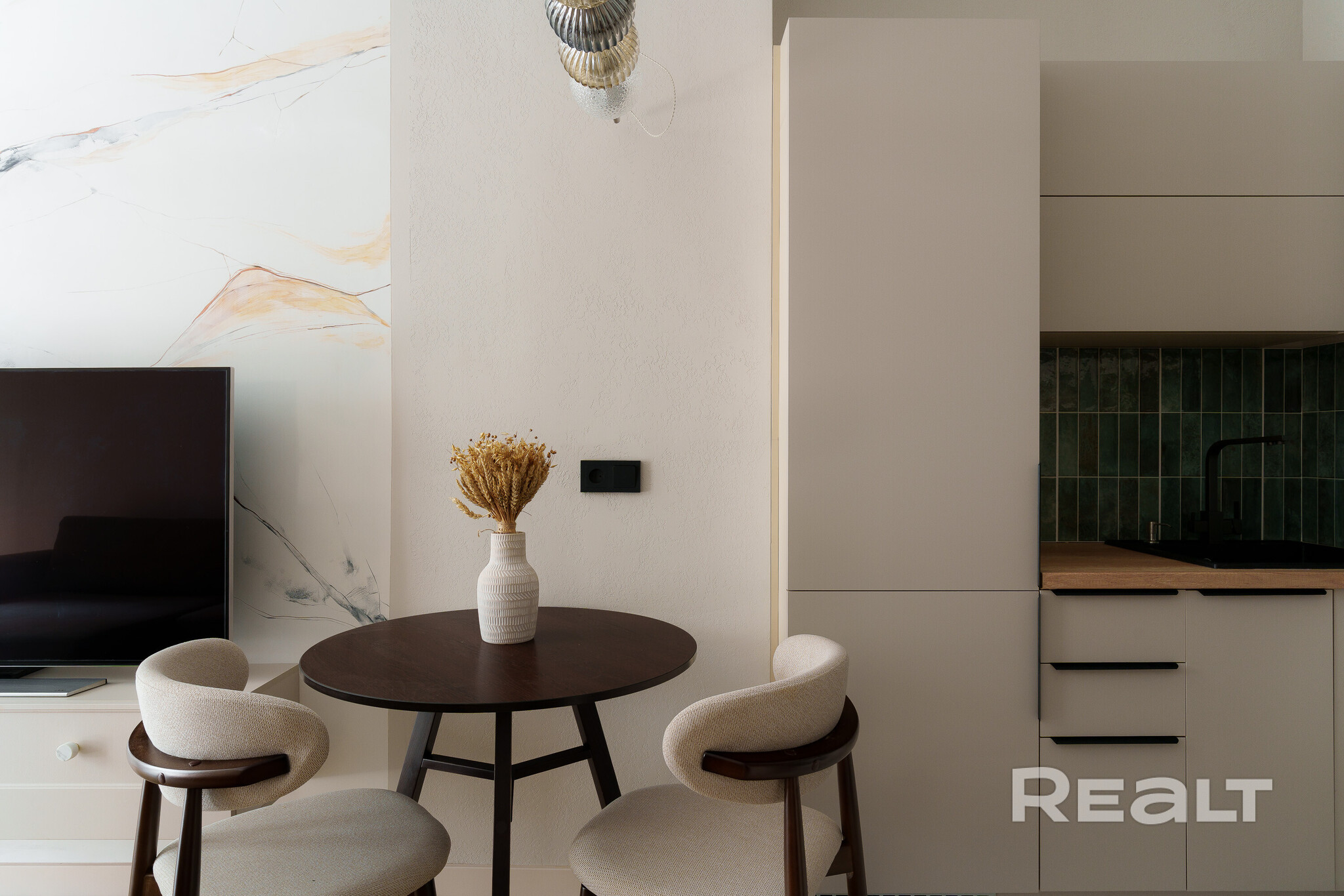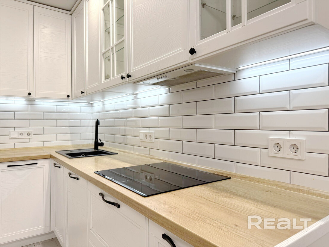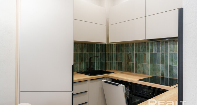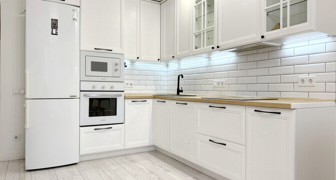 Сделан стильный ремонт. Интерьер выполнен в молочных оттенках. В кухонной зоне яркий акцент — кухонный фартук, выложенный плиткой глубокого зеленого цвета.