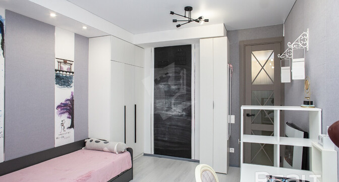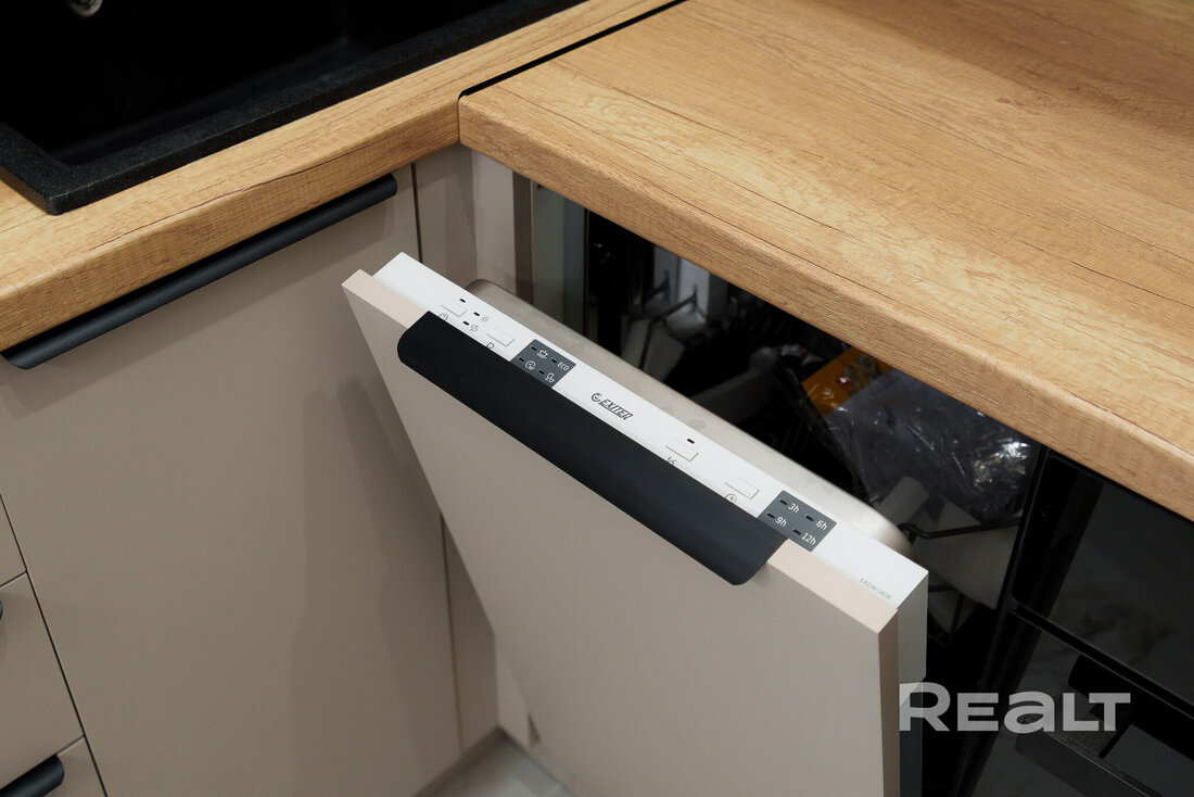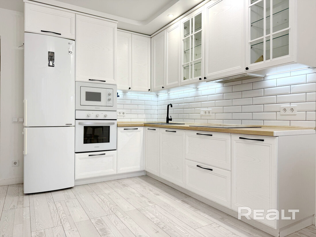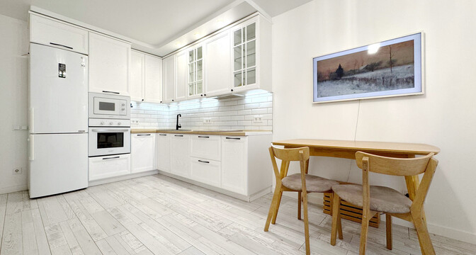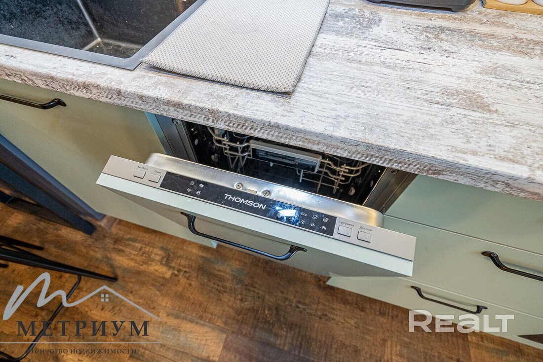 Во всей квартире, включая детскую комнату, светлый интерьер. На полу уложен ламинат Terhurn. Кухня выполнена из массива ясеня. Из техники есть индукционная варочная панель Bosch, духовой шкаф и микроволновая печь Maunfield, вытяжка и посудомоечная машина Hotpoint Ariston.