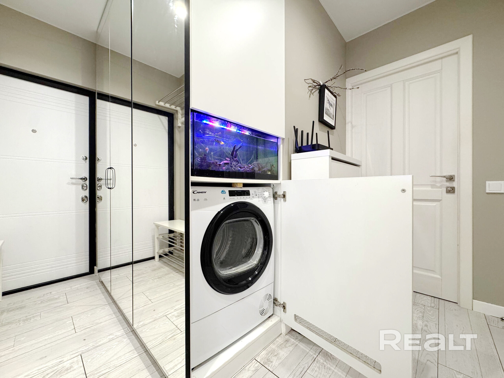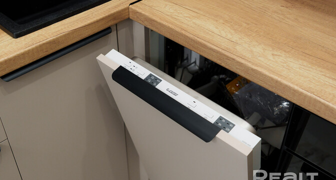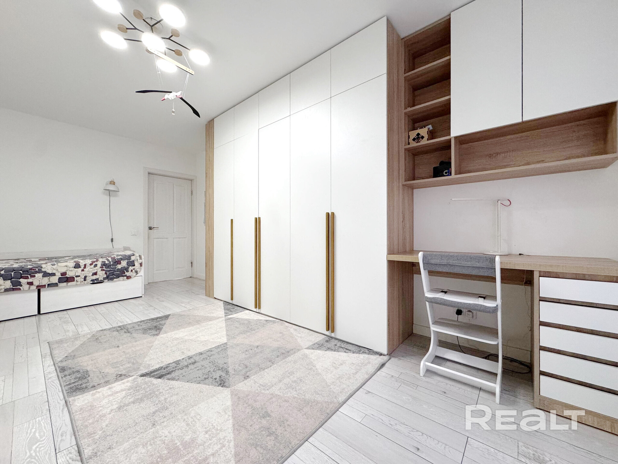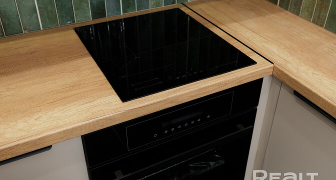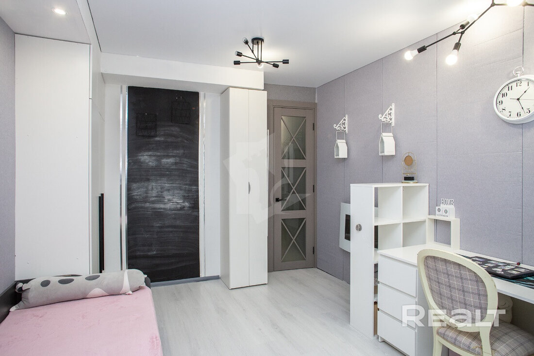 Во всей квартире, включая детскую комнату, светлый интерьер. На полу уложен ламинат Terhurn. Кухня выполнена из массива ясеня. Из техники есть индукционная варочная панель Bosch, духовой шкаф и микроволновая печь Maunfield, вытяжка и посудомоечная машина Hotpoint Ariston.