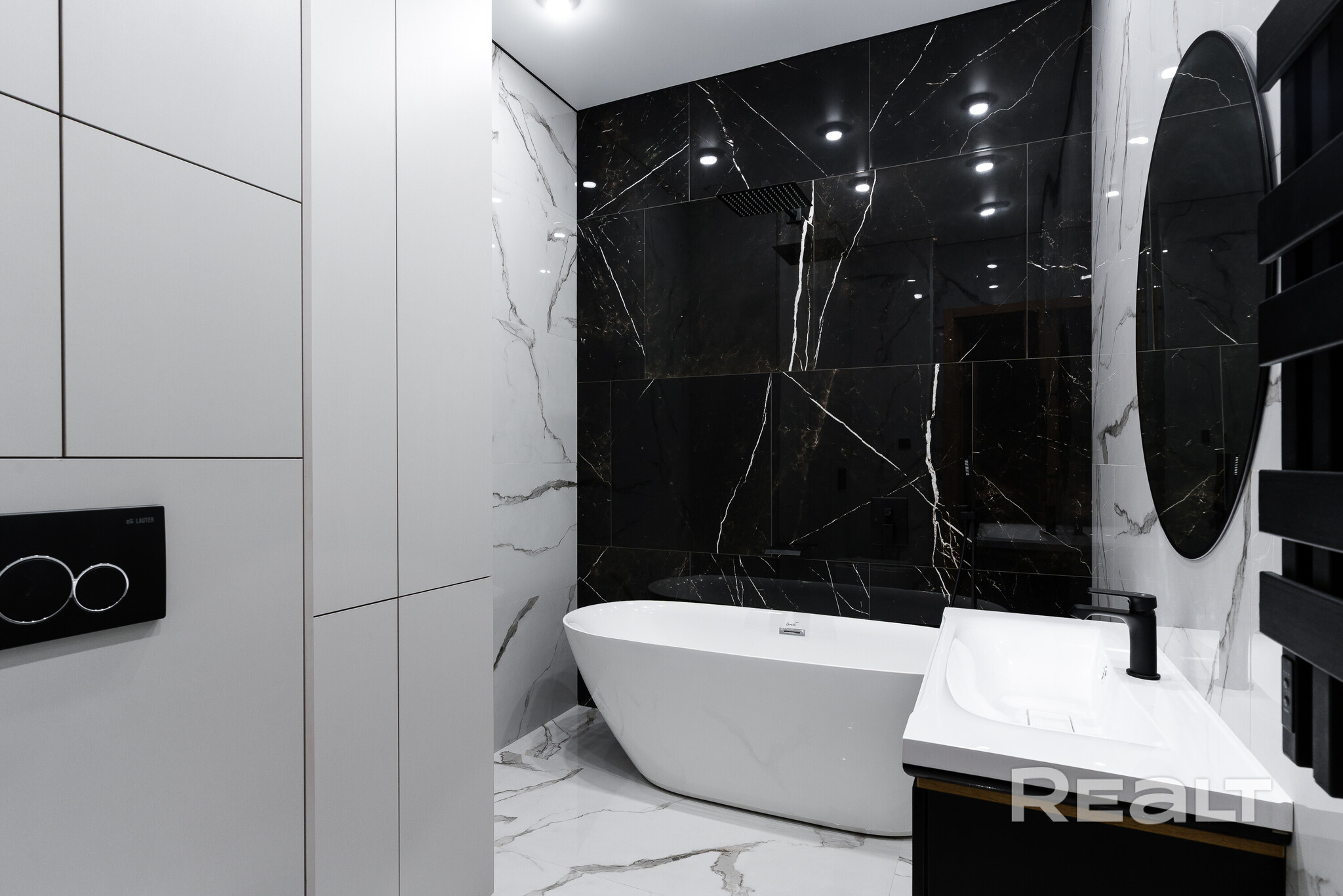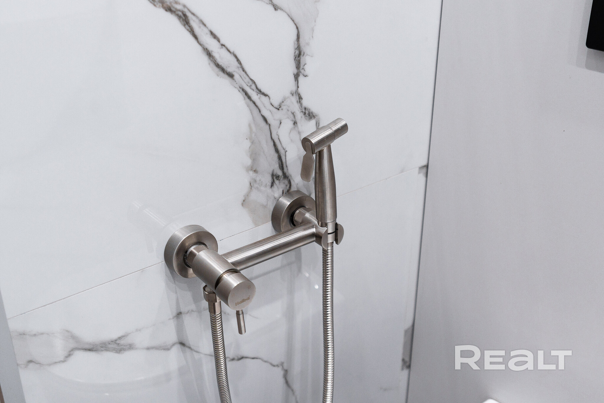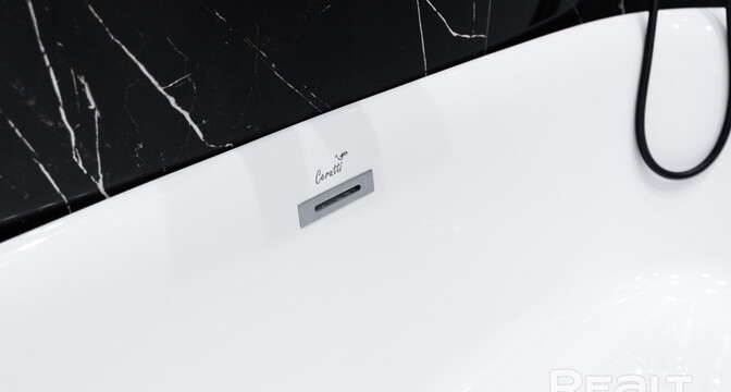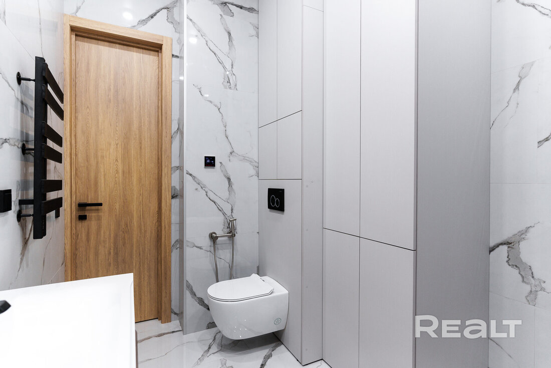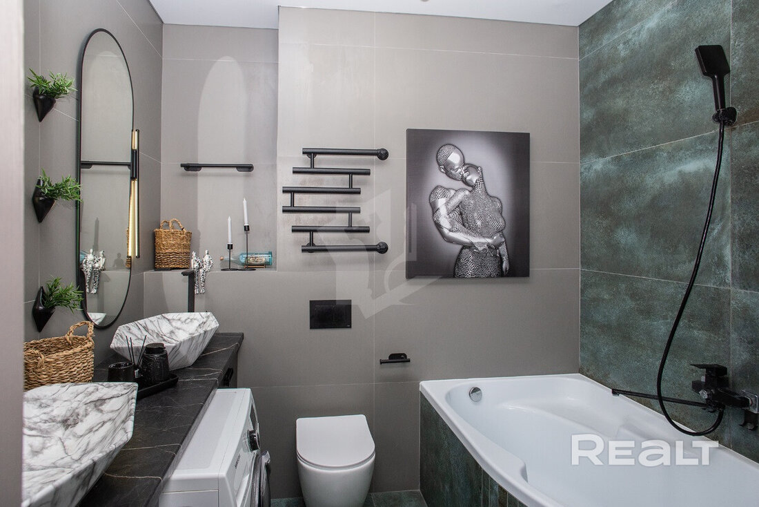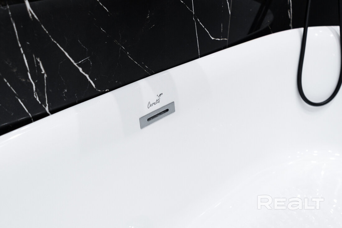 В совмещенном санусле установлена отдельно стоящая ванна, есть гигиенический душ и подключена стиральная машина.