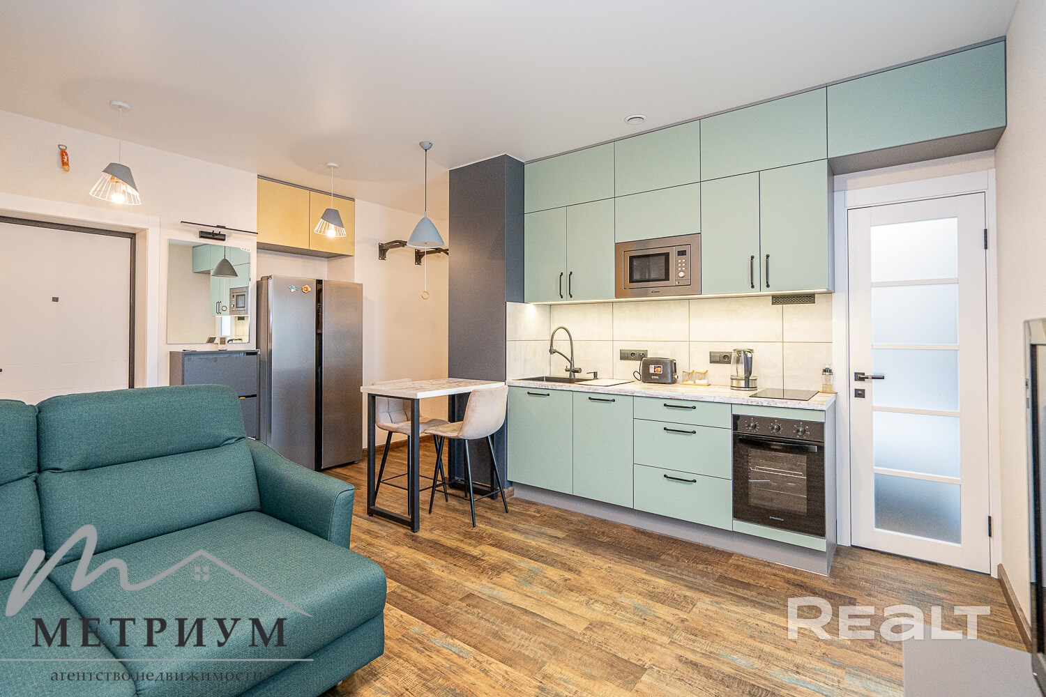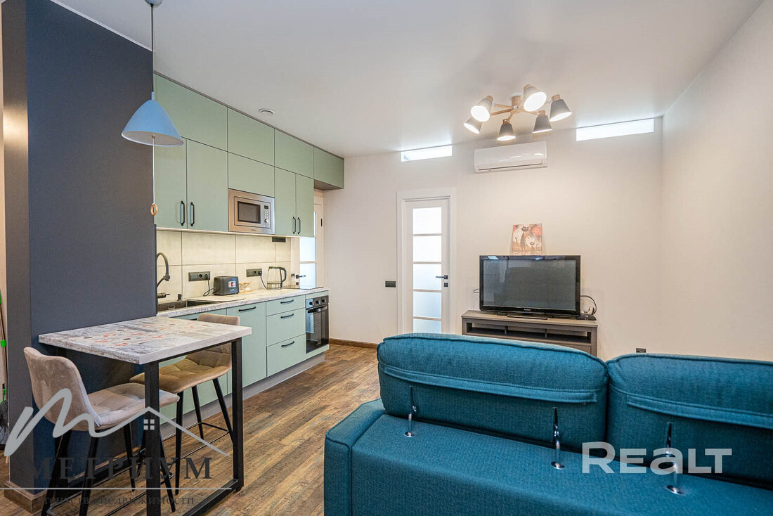 Кухонные фасады выполнены в бирюзовом цвете. Из техники есть посудомоечная машина, духовой шкаф, варочная панель, холодильник и микроволновка. Здесь же рядом с большим диваном стоит телевизор.