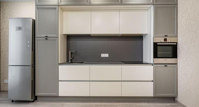 Кухня, совмещенная с гостиной, выполнена в бежевых оттенках. Из техники есть холодильник, духовой шкаф, варочная панель.