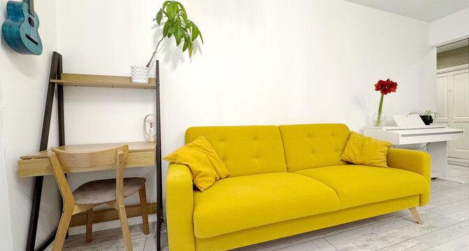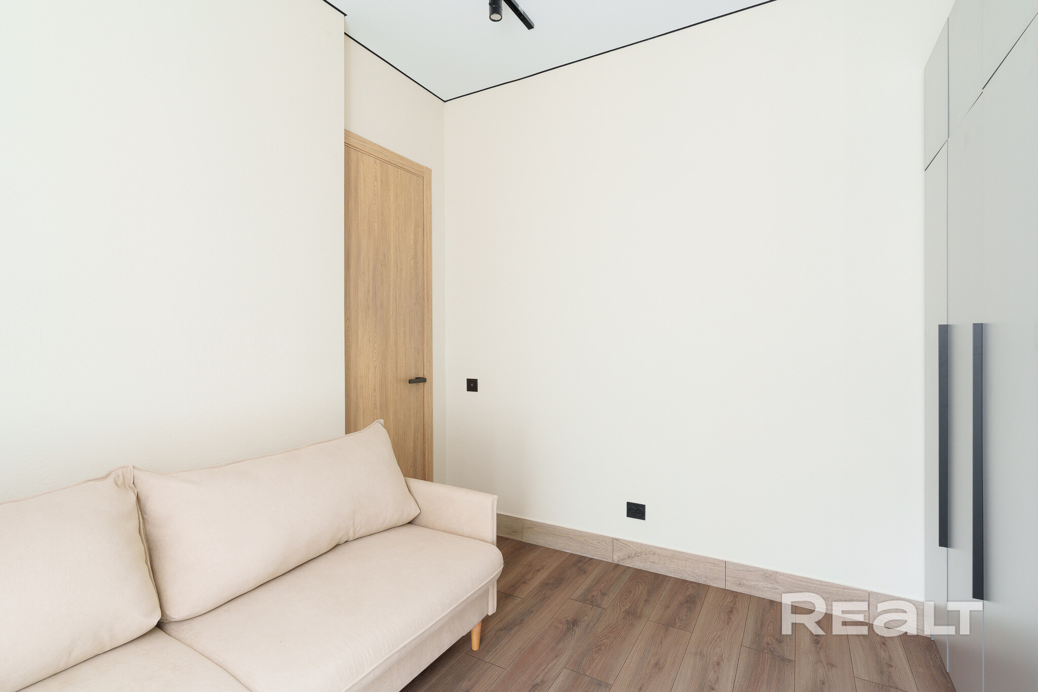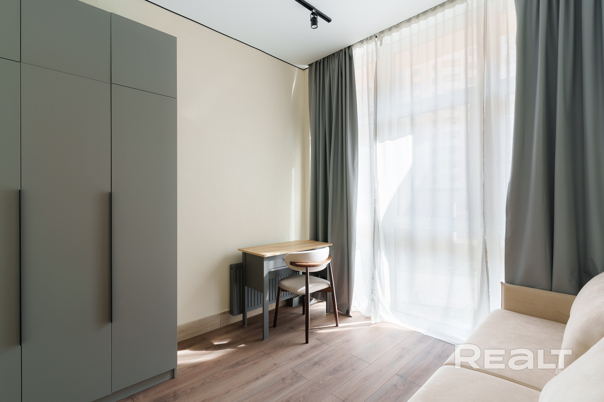 Во второй комнате есть диван, шкаф и небольшой стол.