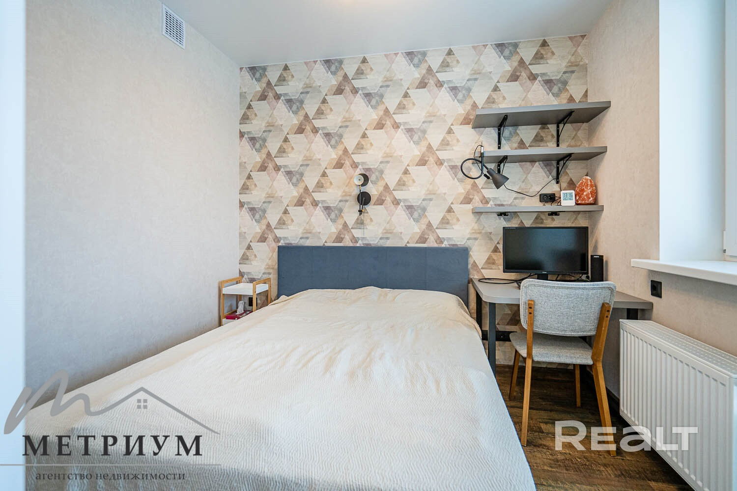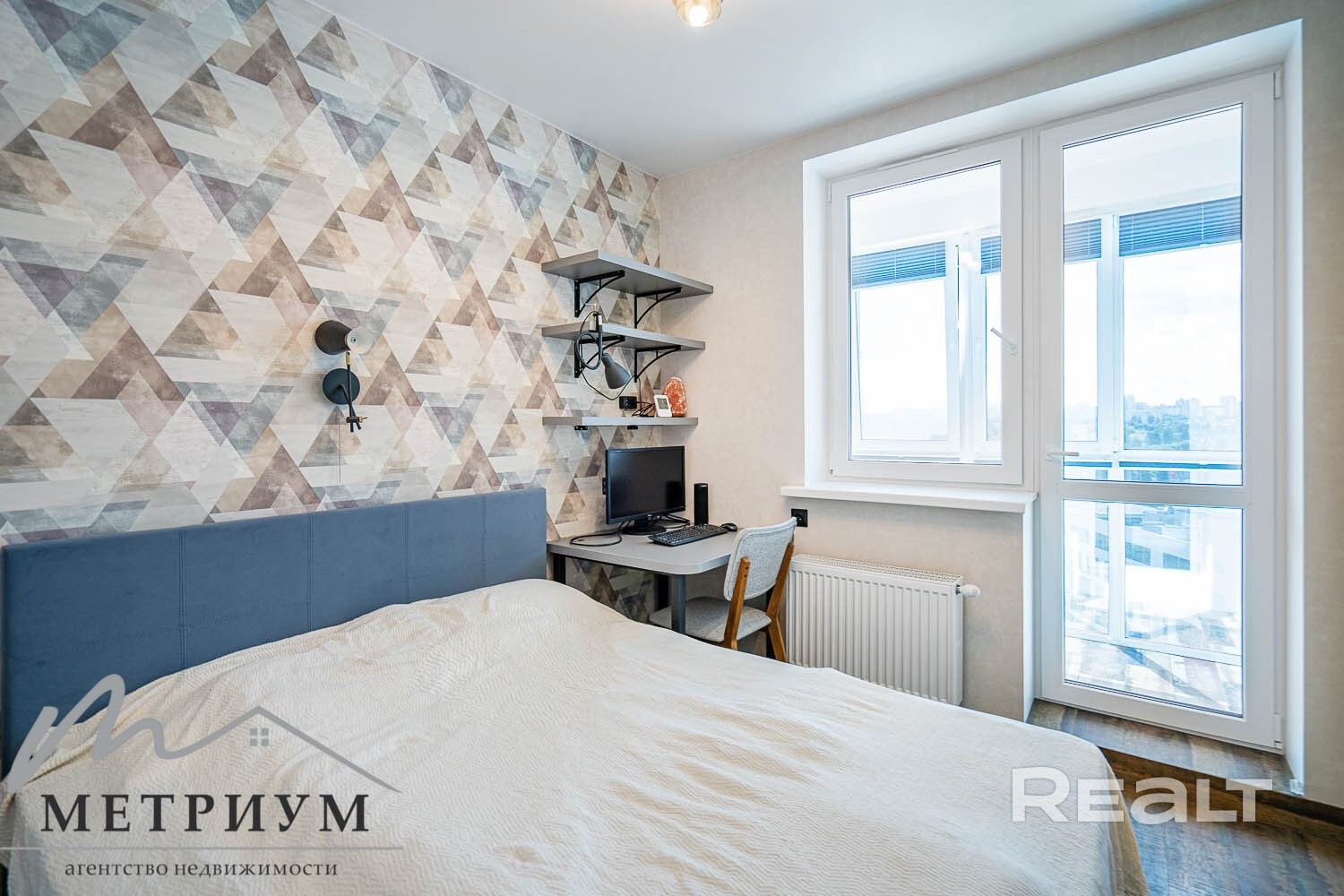 В спальне стоит большая кровать, есть шкаф и рабочее место. В этой комнате выход на застекленную лоджию.