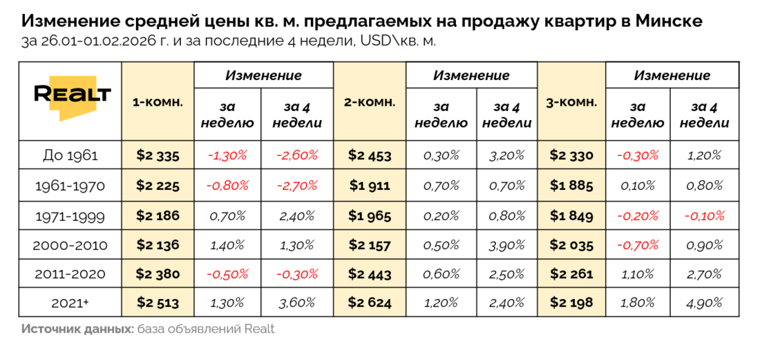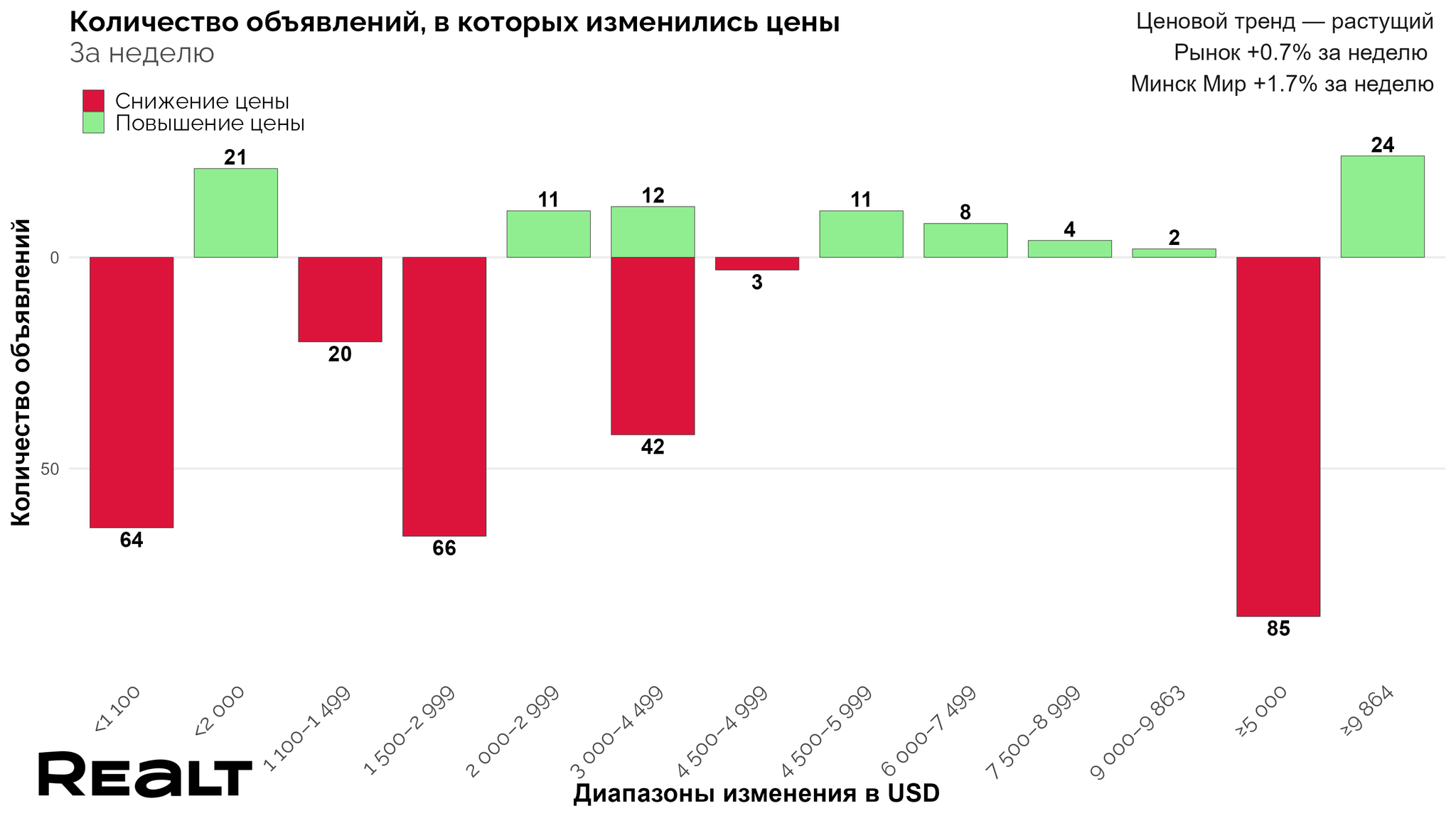 В то же время сохраняется количественный перевес со стороны продавцов, снижающих цены. За последнюю неделю января, подешевело 7% квартир от общего объема предложения (311 квартир, в среднем на 1000−5000 долларов), а доля случаев увеличения цены всего 3% — стали дороже 146 квартир в среднем на 2000−10 000 долларов.