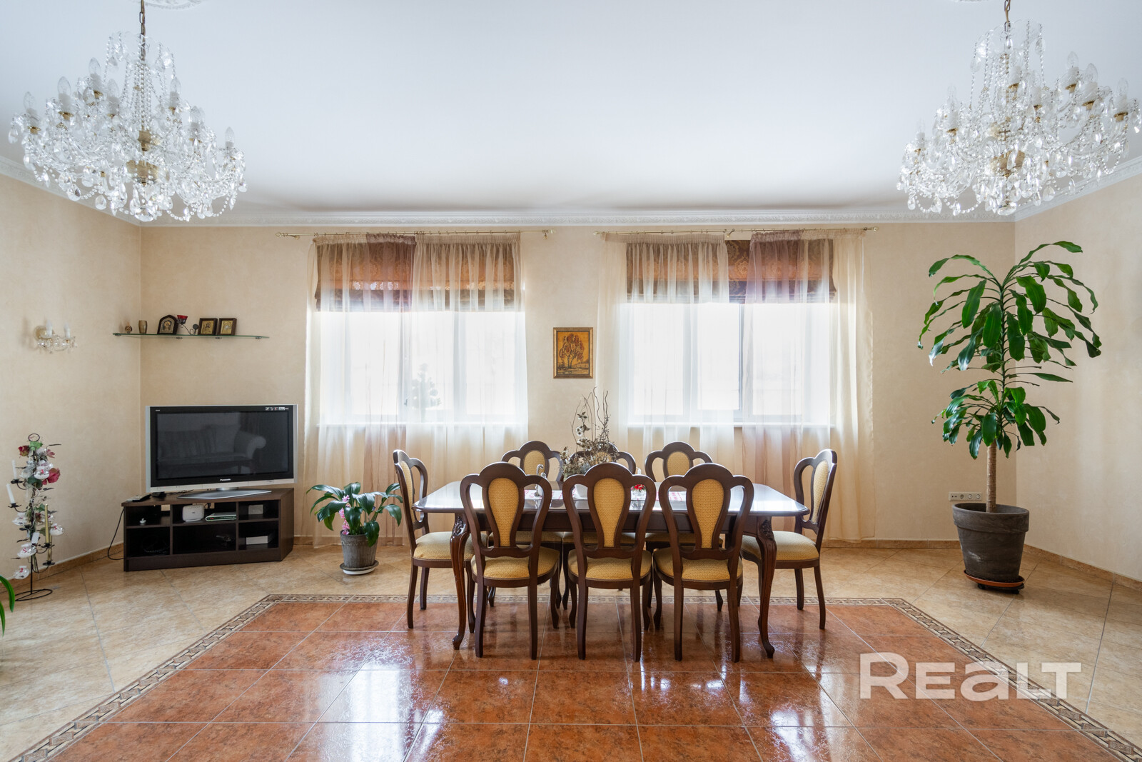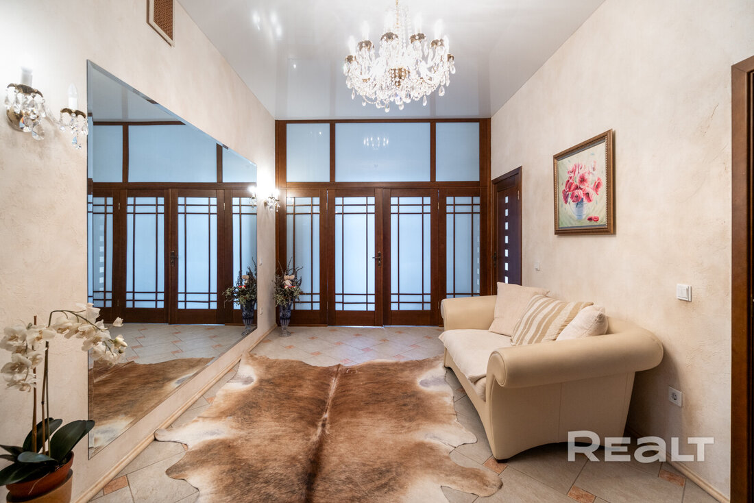 Коттедж полностью готов к заселению, укомплектован мебелью и техникой. Интерьер дома выполнен в классическом стиле. Полы — итальянская плитка и дерево, на стенах — обои. На фотографиях можно заметить благородные двери из массива, штучный паркет, камин с отделкой венецианской штукатуркой и эксклюзивную мебель.