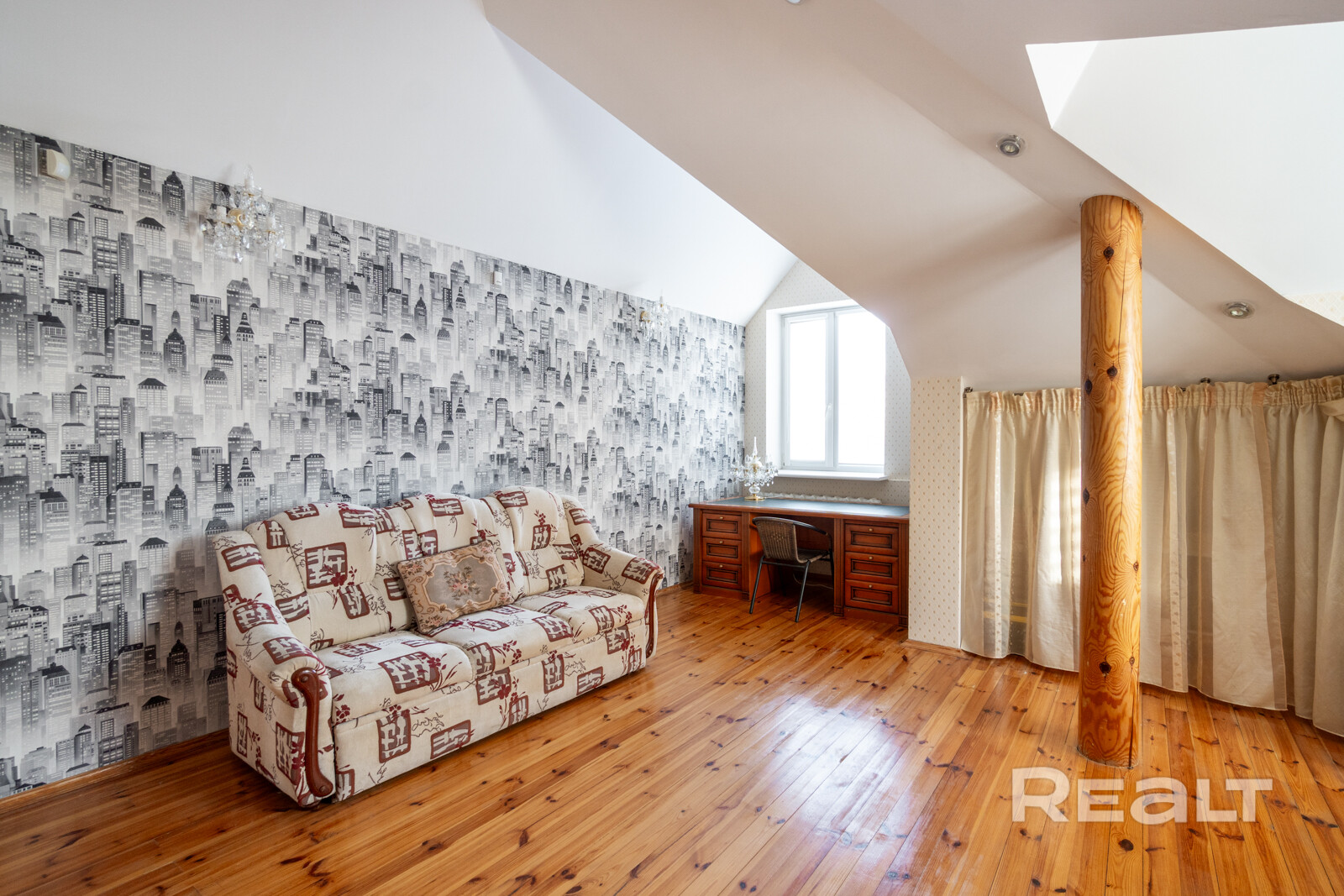 Просторный коттедж с необычным мансардным этажом был собран из газосиликатных блоков в 2007 году. Постройка размещена на фундаменте из блоков ФБС, утеплена и окрашена. В объявлении отмечается, что «дом строился для себя, с большим запасом прочности на долгие годы эксплуатации».