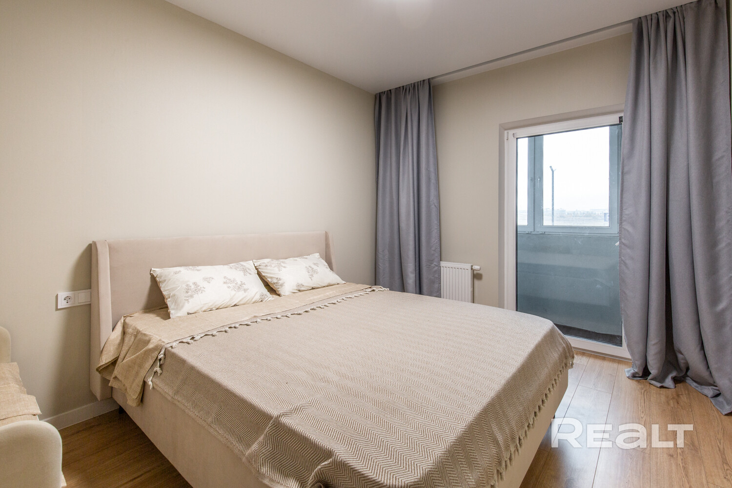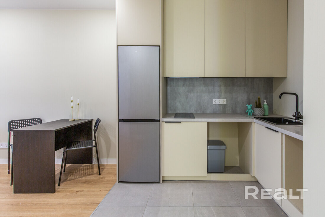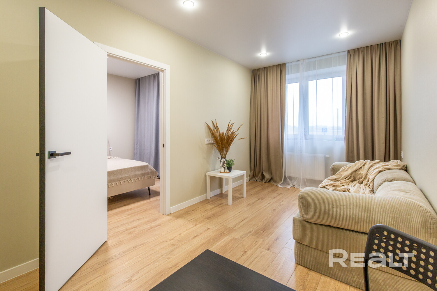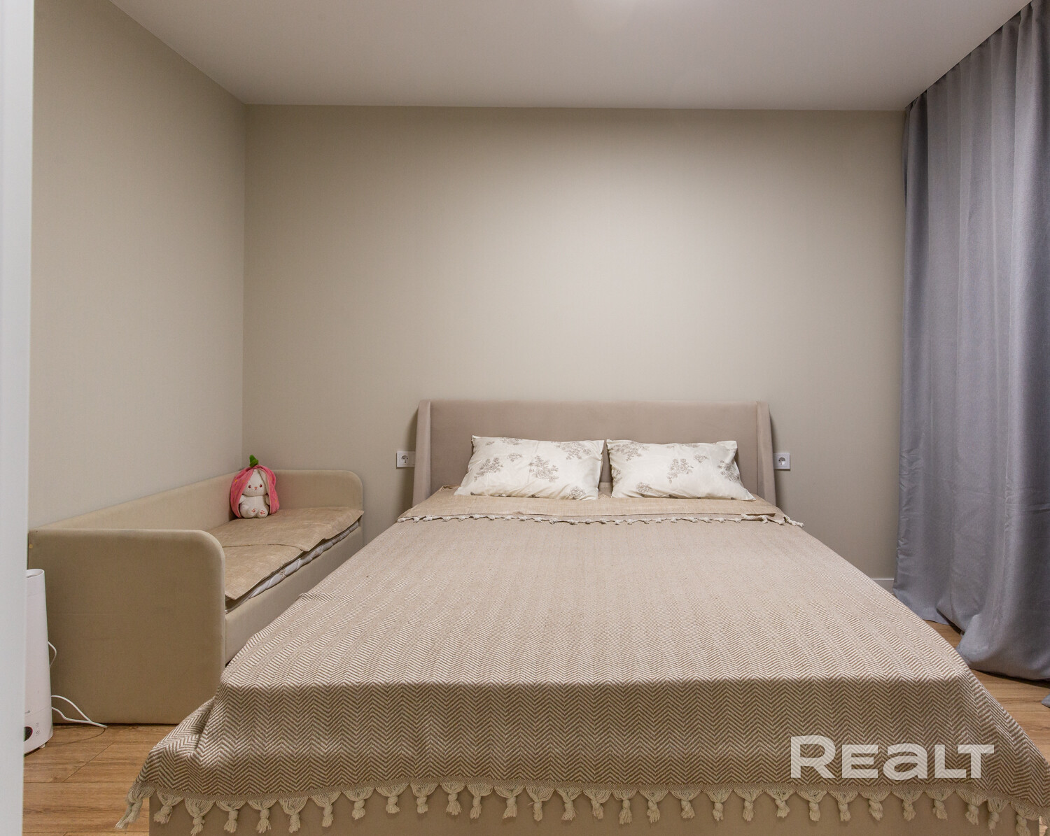 Жилье отремонтировано, декорировано и обставлено. В спальне есть кровать, встроенный шкаф и небольшой диванчик. В зоне гостиной — диван и рабочий стол.