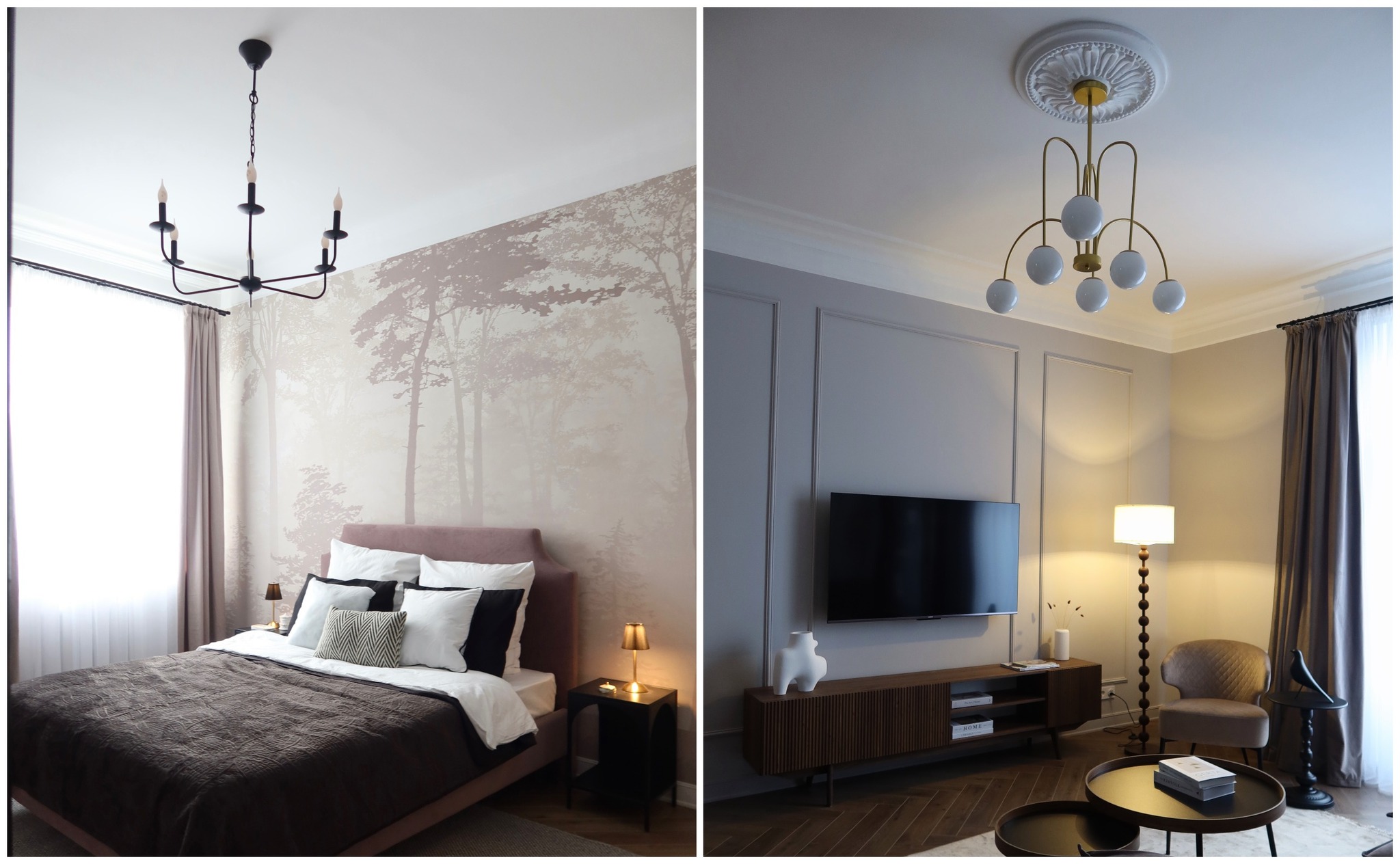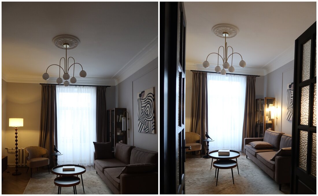 Обе комнаты здесь изолированные. В одной обустроена спальня с кроватью и шкафом. Стены украшают молдинги, на потолке — лепнина и высокие люстры.