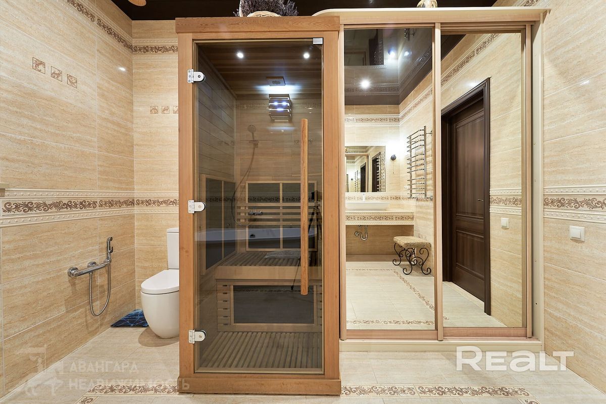 Общая площадь 165,3 м². Внутри продуманная планировка: просторная кухня-гостиная с впечатляющей высотой потолков около 6 метров и выходом на открытую террасу, три спальни, два санузла, один из которых оборудован эксклюзивной кедровой инфракрасной сауной, гардеробная и топочная-прачечная.
