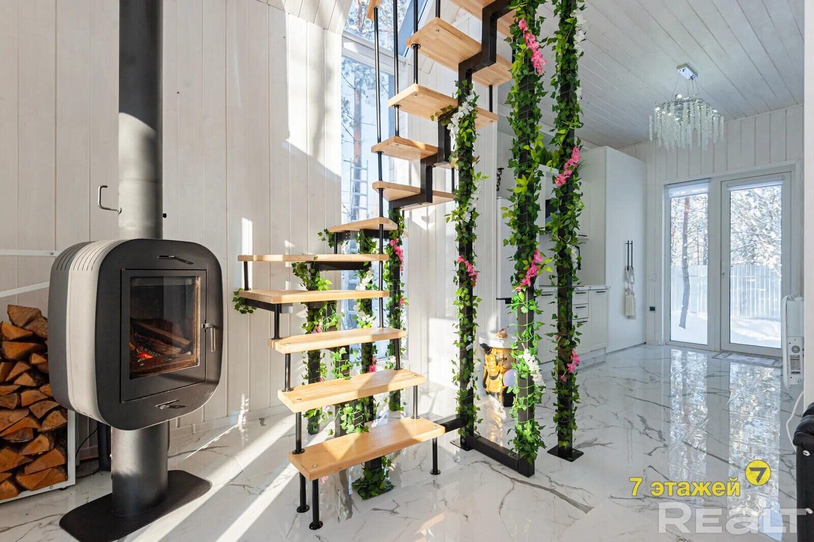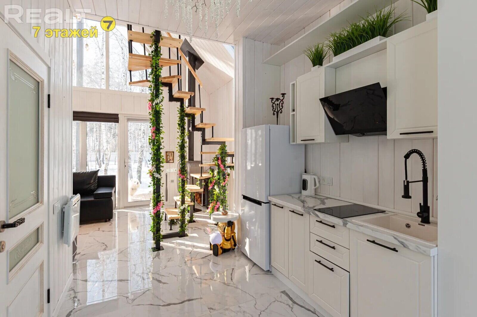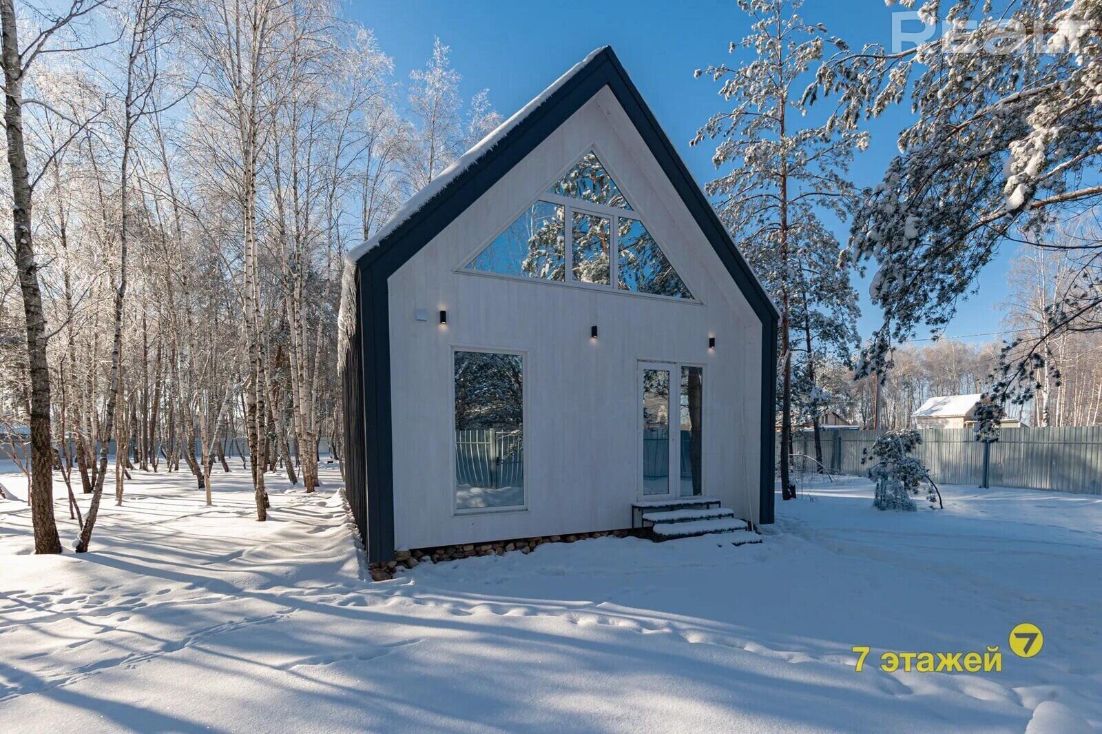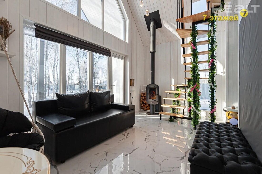 В снегу и среди белых стволов берез эта дача выглядит как в сказке. Это тот случай, когда участок каждую пору года будет смотреться по-особенному, а наблюдать за этим можно через панорамные окна, находясь в доме. Барнхаус построили в прошлом году. Он выставляется с ремонтом и коммуникациями. Рассказываем, как все обустроено и сколько за него просят.