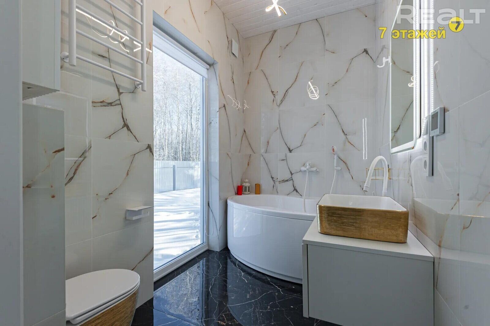 Напротив расположились гардеробная и совмещенный санузел с панорамным окном. Вода поступает из скважины (установлена тройная очистка), отапливаются помещения с помощью печки-камина. Помогают и теплые полы. Канализация — септик.