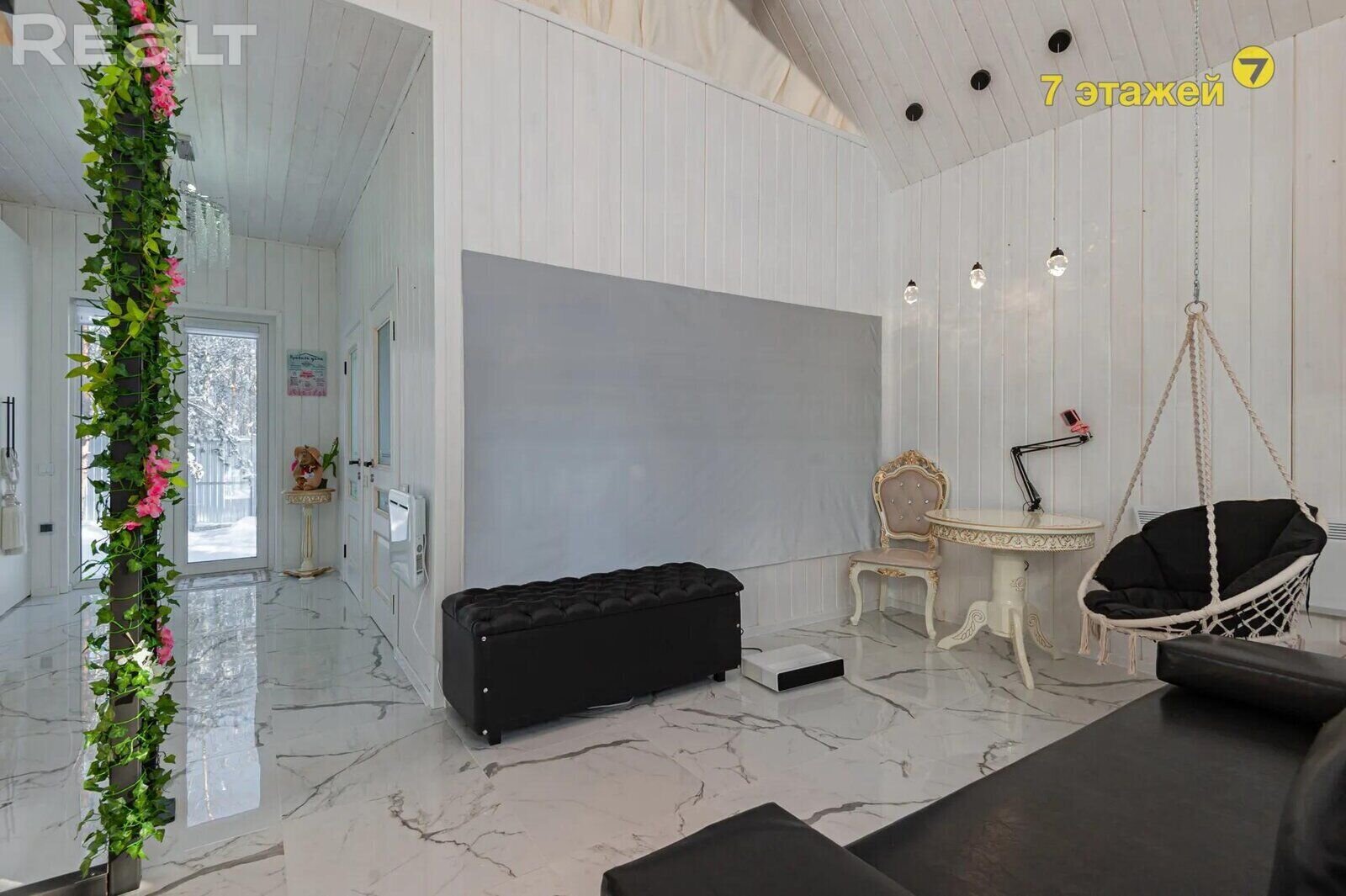 Внутри дом отделан в светлых тонах. Стены и потолок обшиты вагонкой, на полу лежит керамогранит. На первом этаже находятся небольшая гостиная с кинотеатром, чуть дальше обустроена кухня.