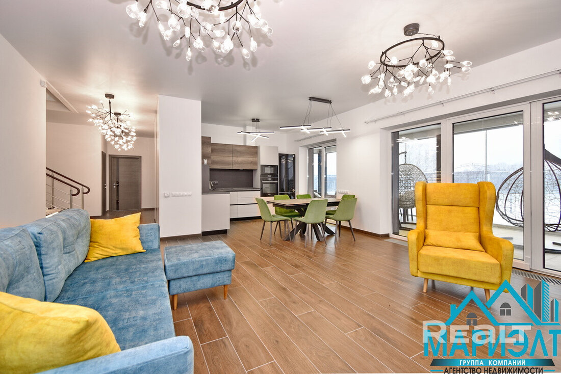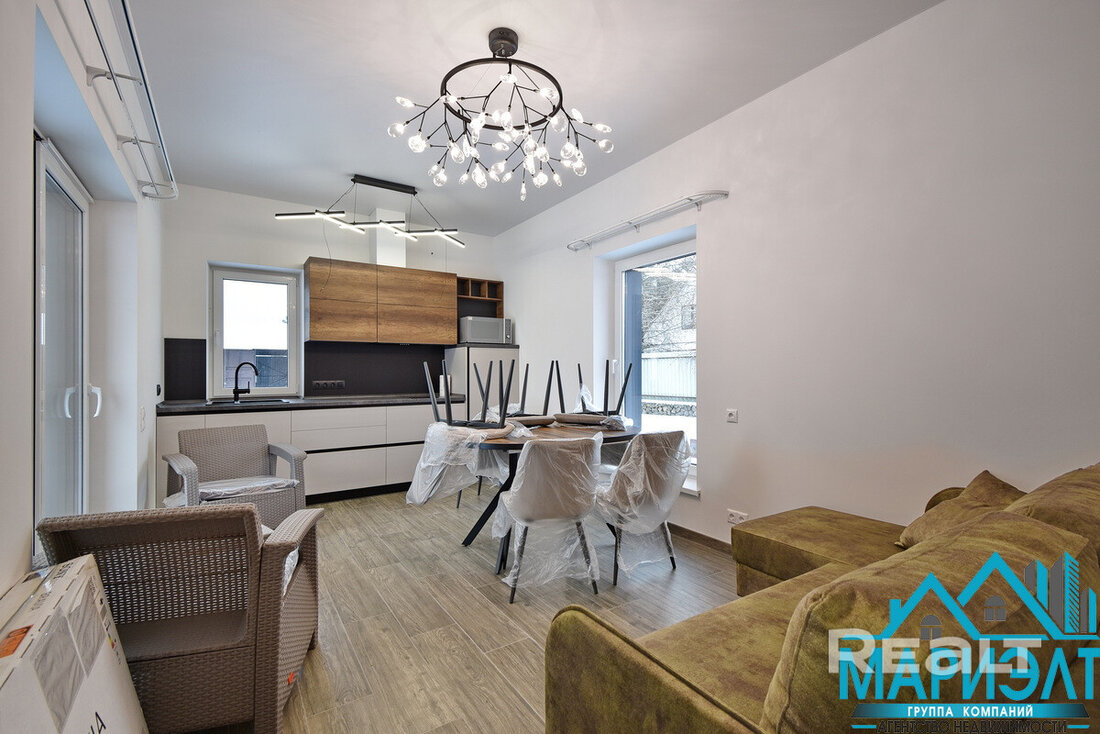 На первом этаже расположилась просторная кухня-гостиная, одна жилая комната и санузел. Все помещения уже стильно и уютно обставлены.
