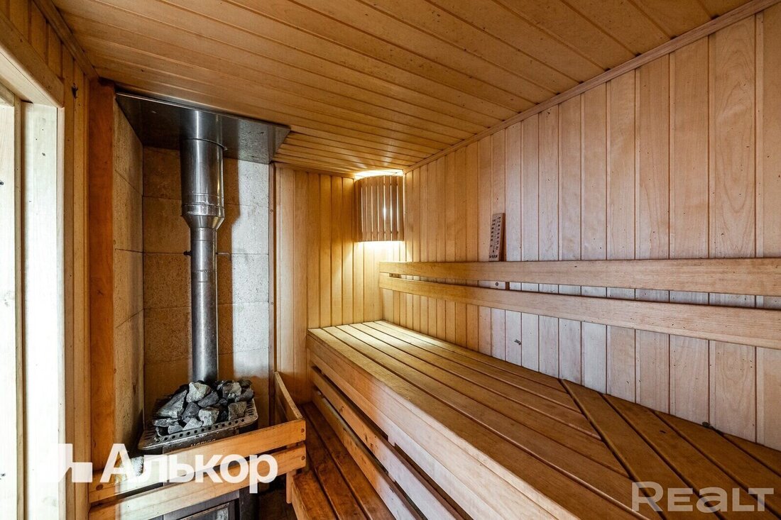 Отдельная постройка — это баня общей площадью 20 квадратов. Гостевой домик состоит из трех комнат: парная, душевая и комната отдыха.