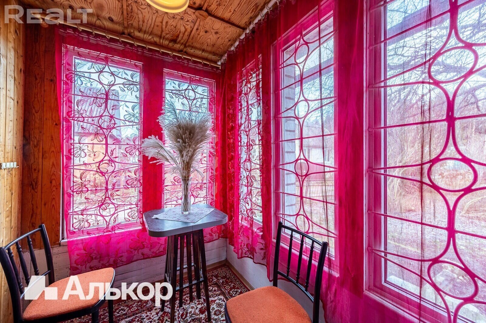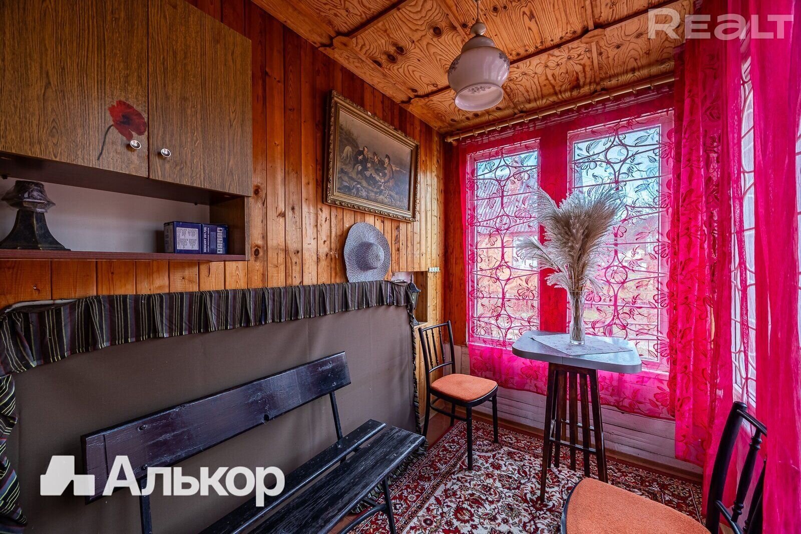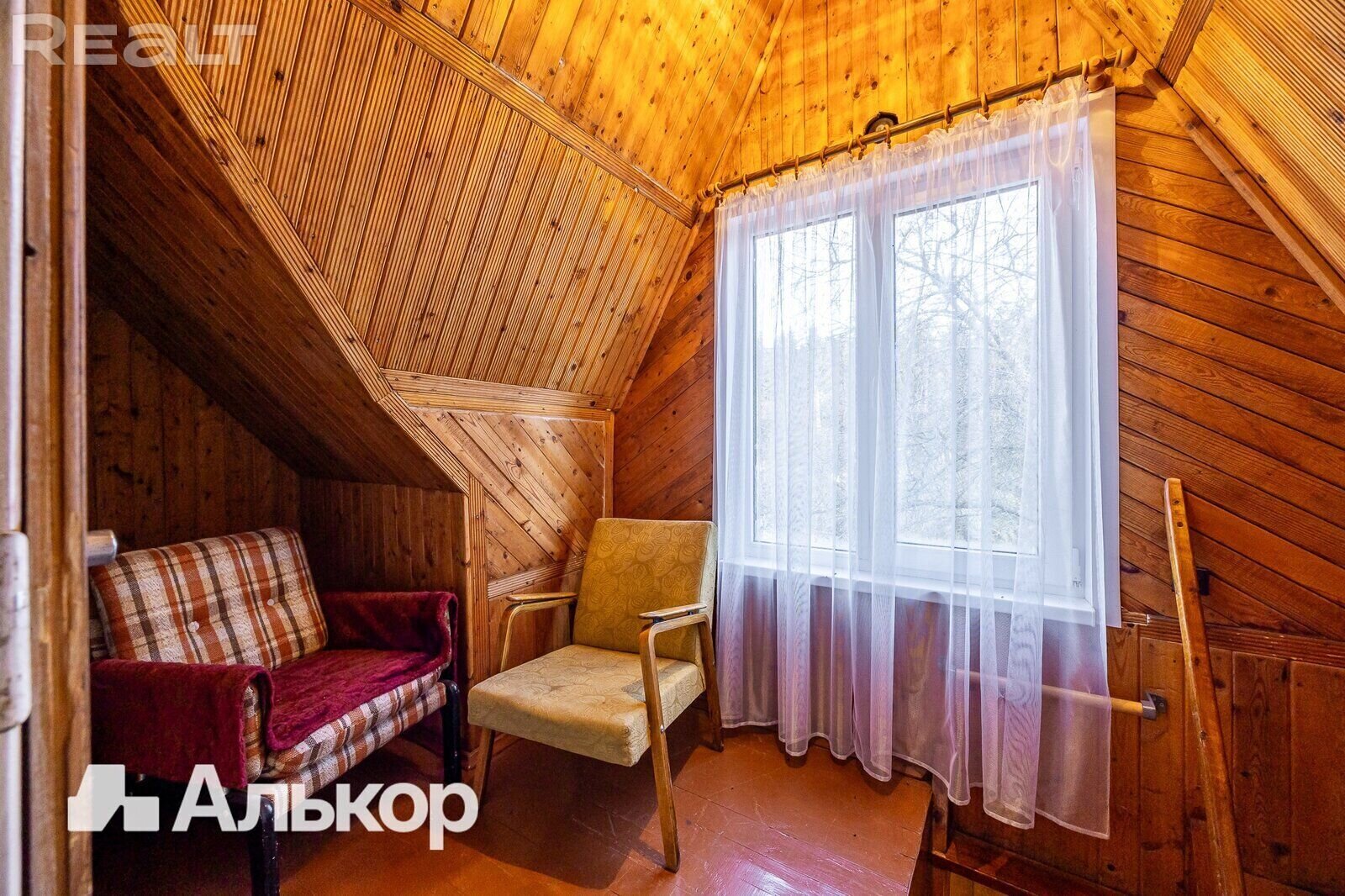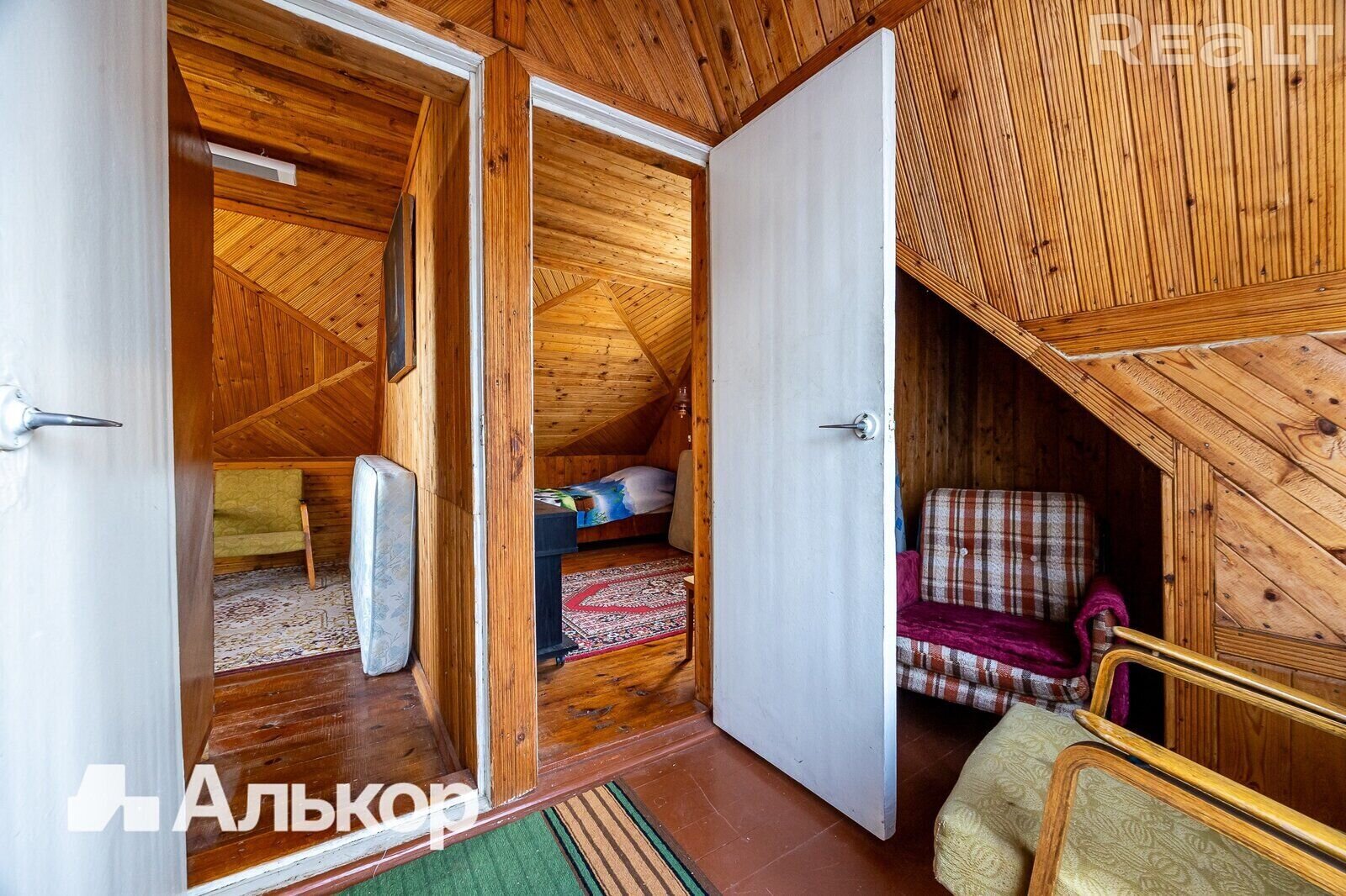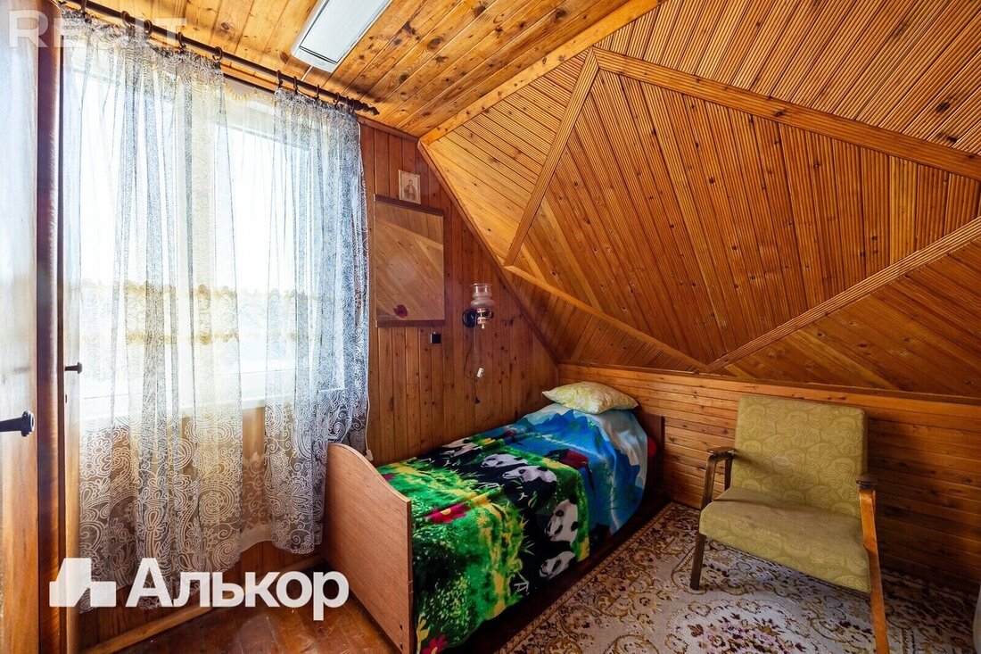 На втором этаже, куда ведет деревянная лестница, можно найти две уютные спальни с оригинальной деревянной отделкой и скошенными потолками, что добавляет уюта. Светлые шторы, мягкие ковры, теплое освещение — мечта для любителей ретро обстановки.