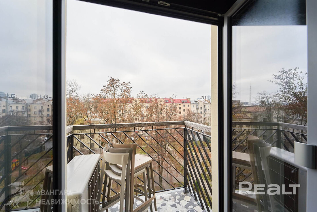 Из окна открывается вид на Купаловский театр и Александровский сквер.