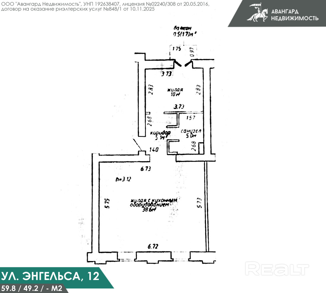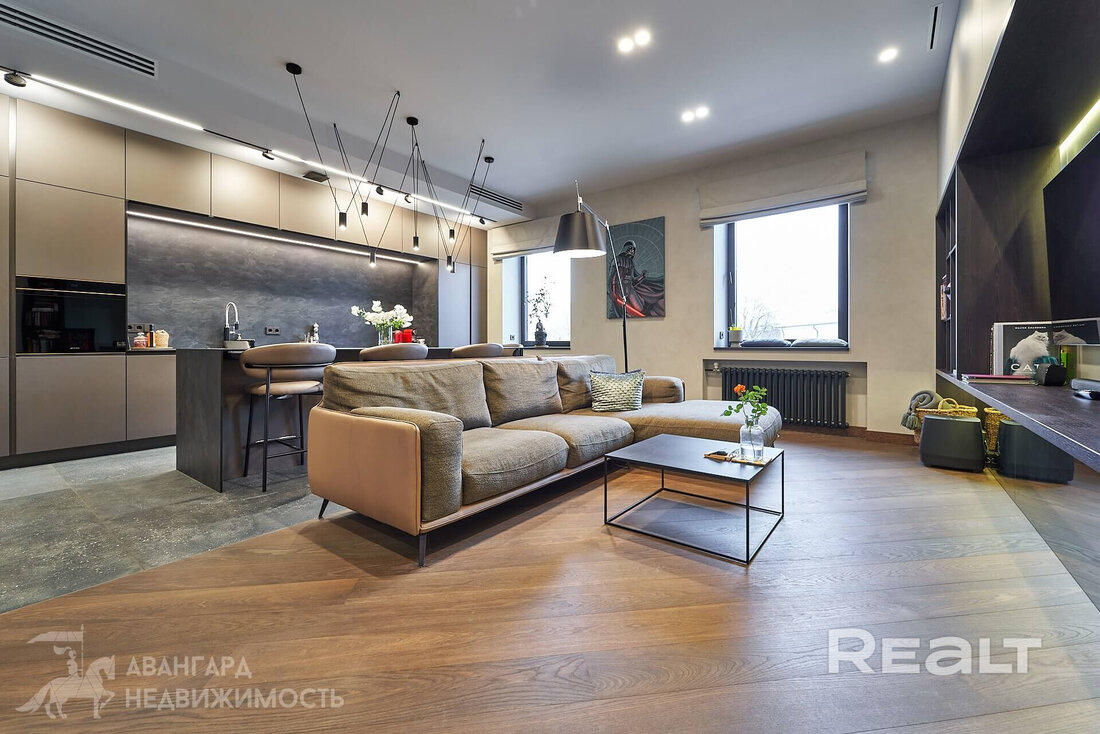 Квартира расположена на пятом этаже. Гостиную объединили с кухней в единое пространство, а в изолированной комнате оборудовали спальню. Перепланировка узаконена. Общая площадь квартиры — 60 квадратов, на жилую приходится 49 метров.