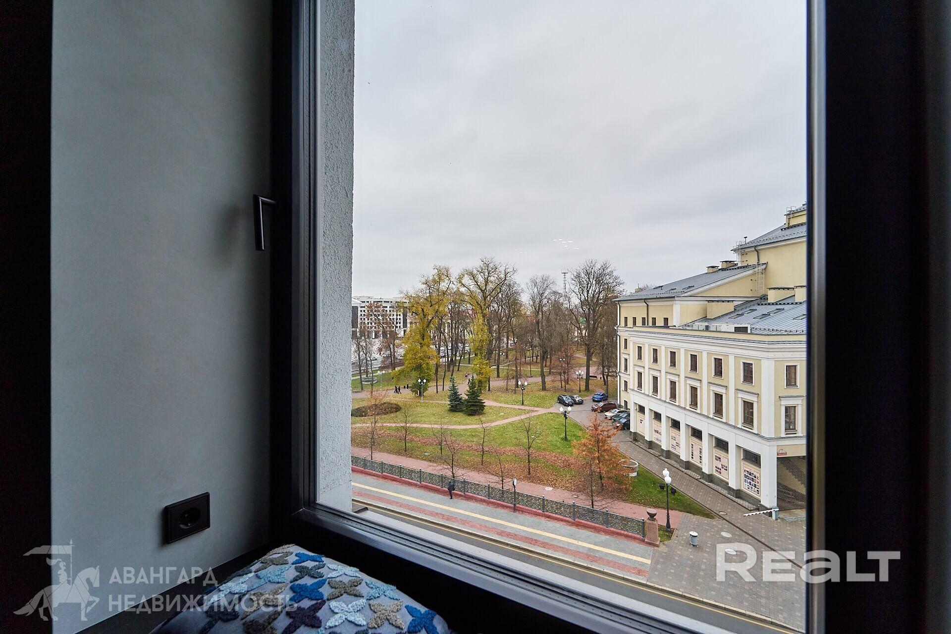 Из окна открывается вид на Купаловский театр и Александровский сквер.