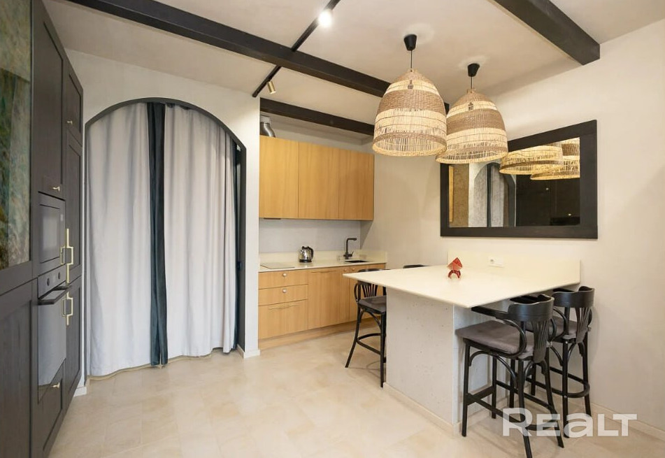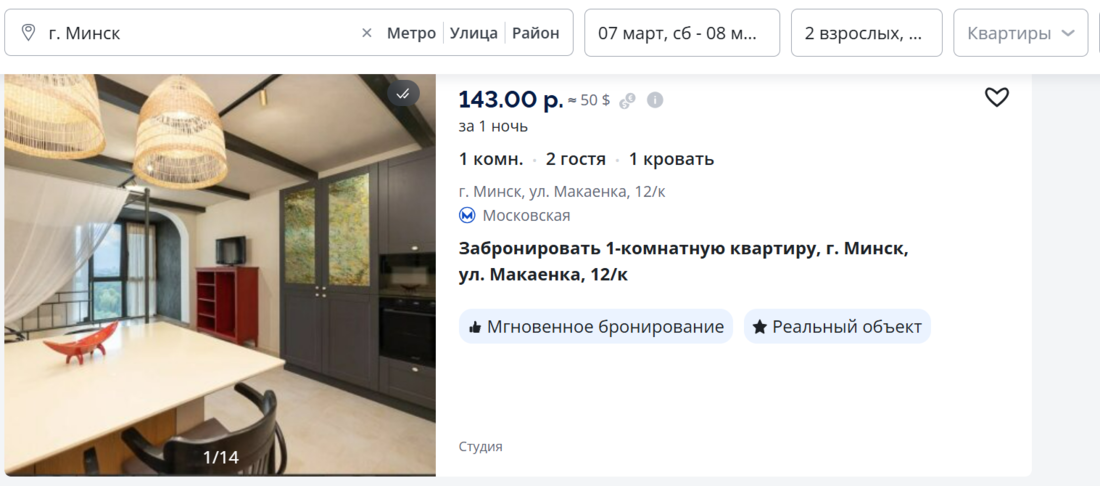 Мы просто вписали в сервисе Realt.Бронь желаемые даты (7−8 марта) для заселения в Минске — и получили множество вариантов квартир на выбор. Конкретно эта квартира привлекла нас симпатичной обстановкой и близостью к главному проспекту, парку и метро. Сутки в такой квартире на выбранную нами дату стоят 143 рубля (около 50 долларов).