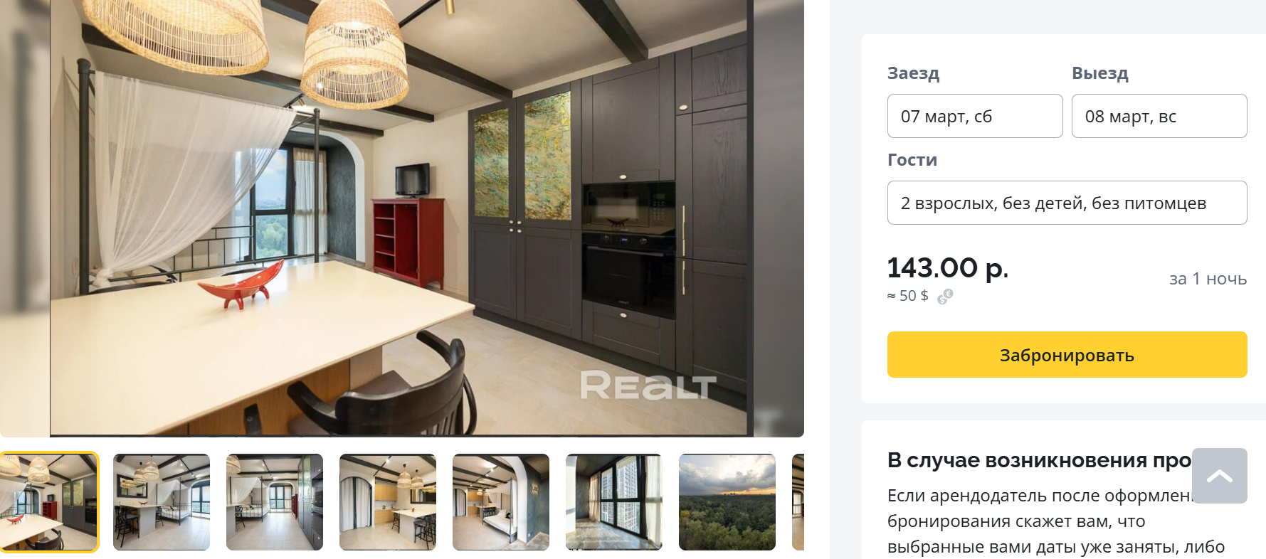 Мы просто вписали в сервисе Realt.Бронь желаемые даты (7−8 марта) для заселения в Минске — и получили множество вариантов квартир на выбор. Конкретно эта квартира привлекла нас симпатичной обстановкой и близостью к главному проспекту, парку и метро. Сутки в такой квартире на выбранную нами дату стоят 143 рубля (около 50 долларов).