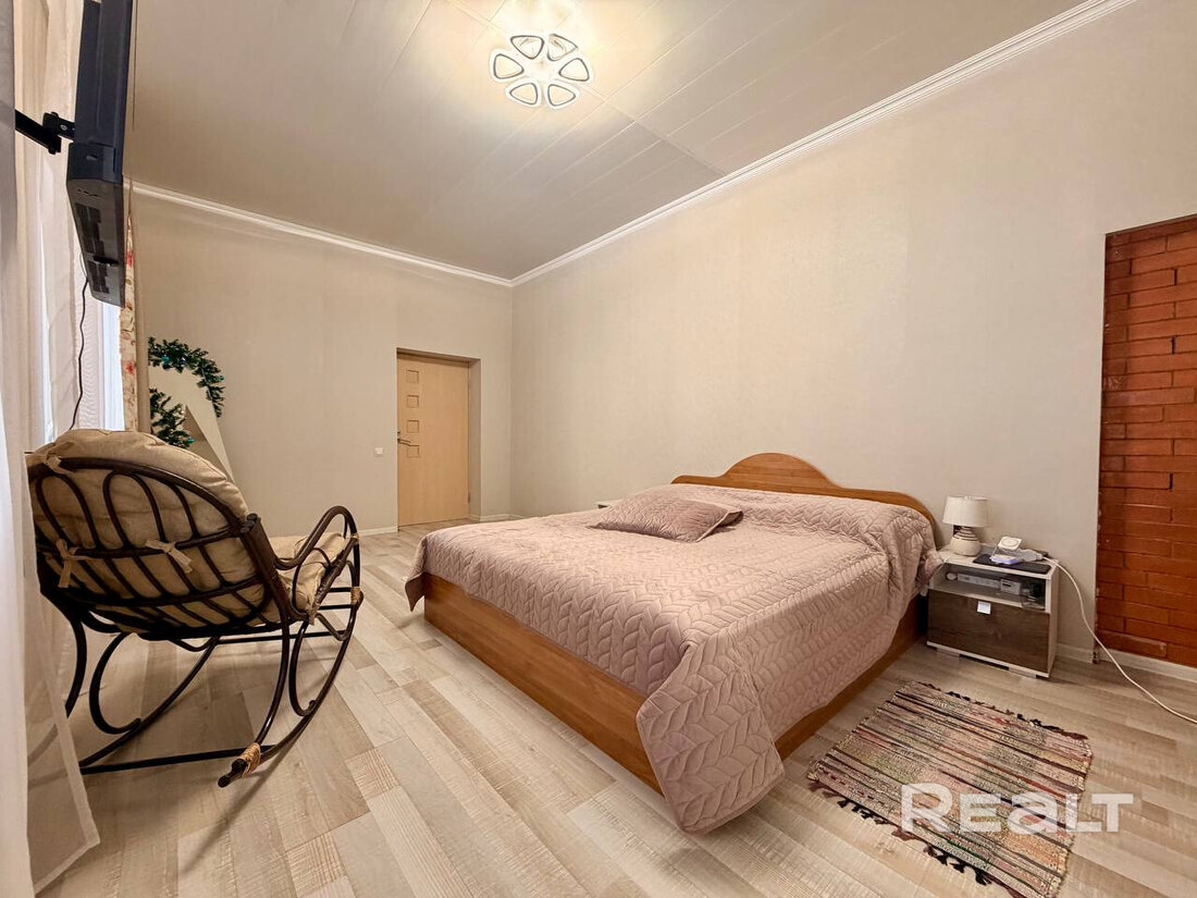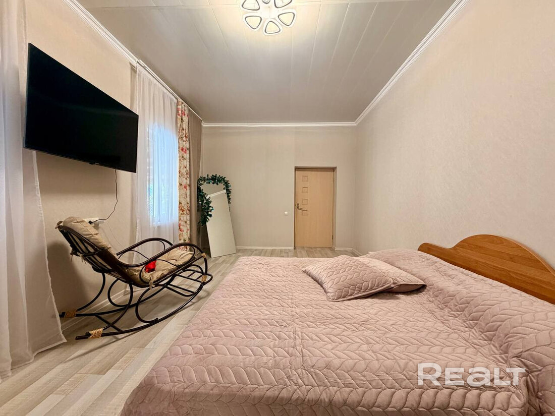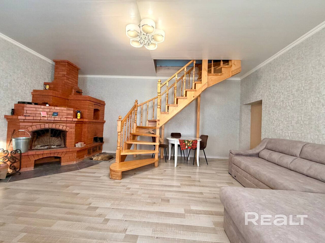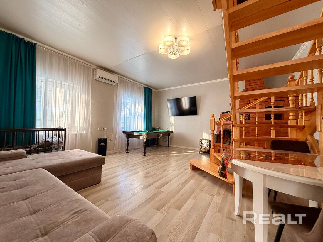 Внутри дома 2019 года постройки сделан современный ремонт в светлых тонах. На стенах тут поклеены обои, на полу и потолке — ламинат. Пространство уже наполнено мебелью и деталями интерьера.