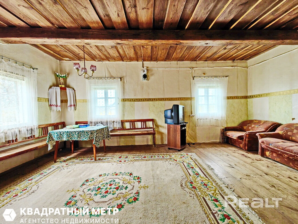 Дом внутри сохранил аутентичную атмосферу деревенского дома — полы из массивных широких досок, деревянный потолок, лавки у стола и «фіранки на вокнах». Обои не стенах уже повидали на своем веку, но срочной замены не требуют.