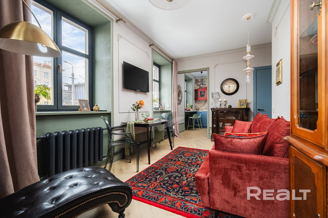 № 1. Двухкомнатную сталинку на площади Я. Коласа в объявлении описывают как «редкую, эксклюзивную, с премиальной отделкой и утонченным дизайном». И на наш взгляд, это действительно так. Площадь 63 кв.м., 1958 г. п., но в доме уже есть лифт, что с учетом расположения квартиры на 6 этаже, очень актуально. Жаль только санузел совмещенный. Очень много интересного рассказано про ремонт — перечислять не будем, но советуем почитать в объявлении. Действительно, есть на что посмотреть. При этом мебель остается и уже включена в стоимость. А она, не из бюджетных: с учетом подорожания за прошлую неделю на 39 000 $, на момент подготовки материала ее стоимость составляет 279 000 $ или 4 596 $ за метр. Своего рода, исторический аналог квартире в DEPO.