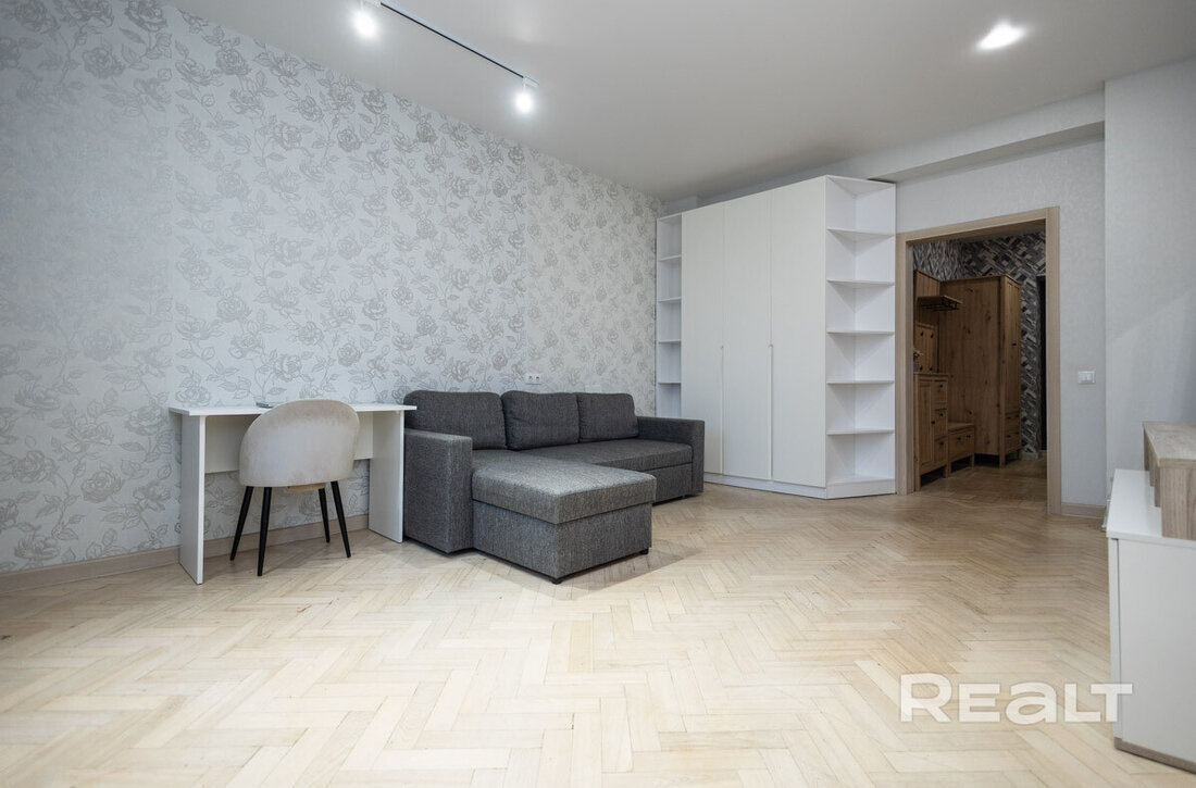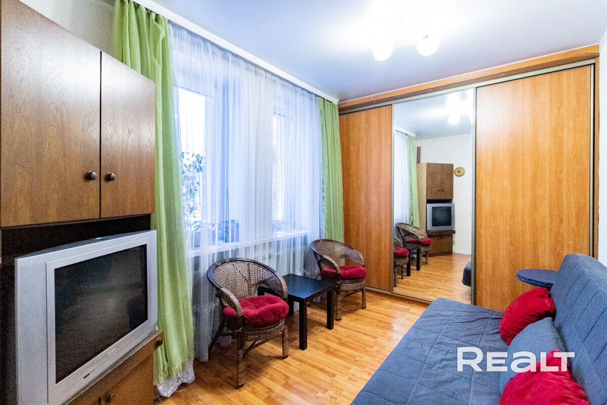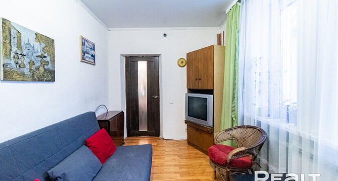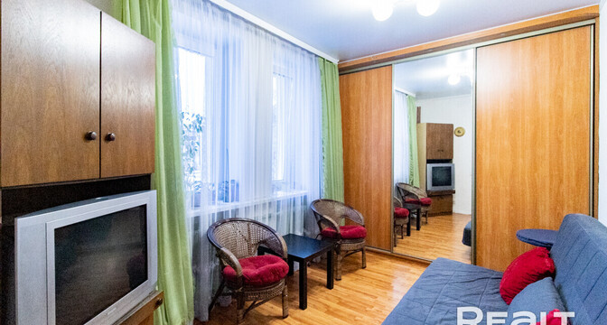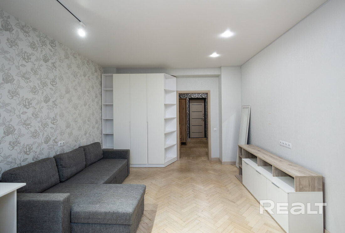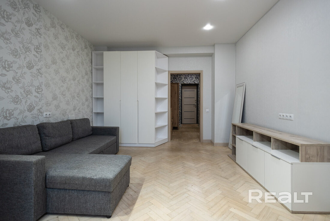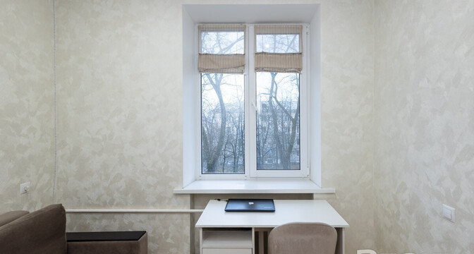 Квартира расположена на первом этаже. Ее общая площадь — 26 квадратов, а жилая — 14 квадратов. Потолки — 2,9 метра. Стены выровнены, поклеены обои. Потолки натяжные матовые. На полу линолеум. В комнате стоит раскладной диван, установлен шкаф-купе. Санузел совмещенный.